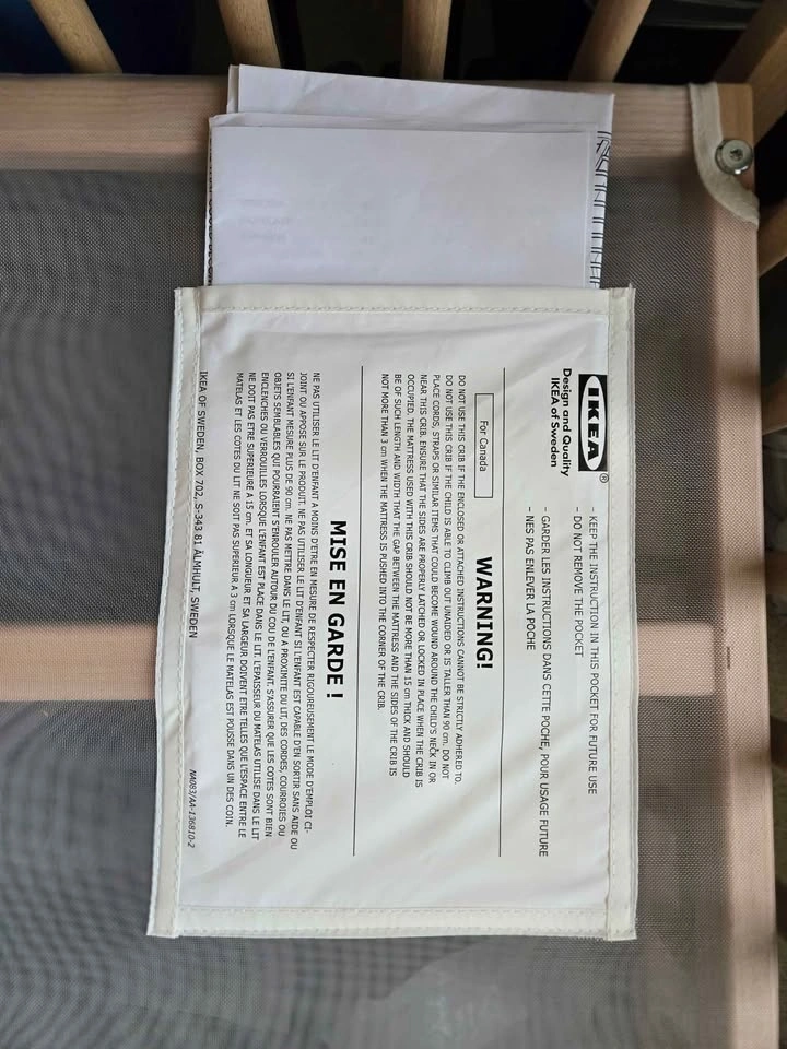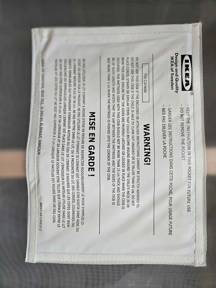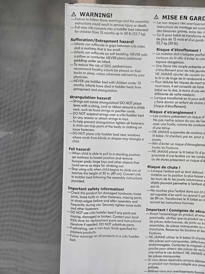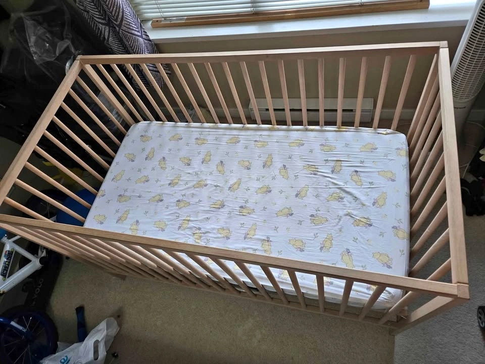 60IKEA crib - $50 IKEA mattress for same crib - $20 (most of the time used with water proof padding) Prefer to sell both together $50+$20. In good condition. No issues. With all required parts and manual to assemble again. Non-smoking, no pets home. Pickup only. On IKEA website - brand new one is for $139+$60 for mattress. Your baby sleeps safely and comfortably in this crib. Made from solid beech – a durable and renewable natural material that is both good for your wallet and the planet.