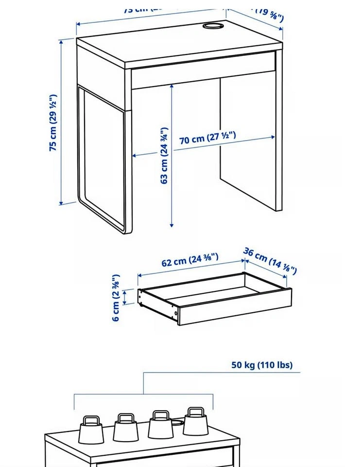 This sleek, used IKEA desk features a clean design with a convenient drawer and a hole for cable management, making it a practical addition to any workspace with dimensions of 75 cm (29 1/2") height and 75 cm (29 1/2"). Here are some specs: * Dimensions: 75 cm (29 1/2") height and 75 cm (29 1/2") length. * Features: One drawer, cable management hole. * Condition: Used but well-maintained. If the ad is up, the desk is available!