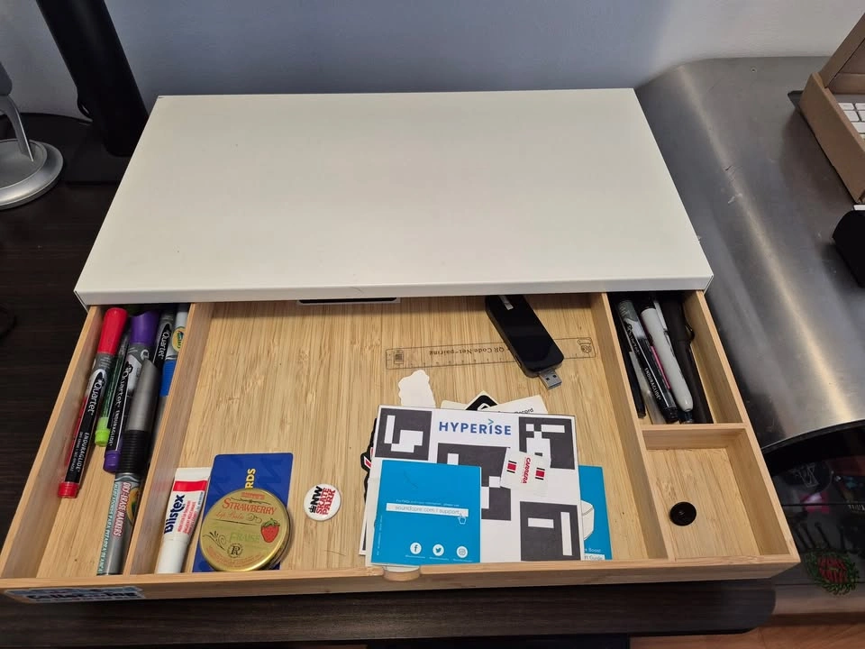 80Keep your workspace tidy with this versatile IKEA desktop organizer. The bamboo drawer with compartments keeps your essentials sorted, while the metal shelf top provides extra space, even for your monitor to raise it to a more ergonomic position. Why You'll Love It: - Smart Organization: Bamboo drawer features four compartments to sort pens, sticky notes, cables, chargers, and office supplies - Extra Surface Space: White metal top provides a clean platform for your phone, a small plant, a desk lamp, or frequently-used items - Versatile Placement: Works great on any desk, vanity, craft table, or workspace - Bonus Option: Can also elevate your monitor to a more ergonomic height if needed - Clean, Modern Design: White metal construction with natural bamboo drawer complements any décor style - Space-Efficient: Compact footprint maximizes organization without taking up too much room Dimensions: - 18½"W × 10"D × 4¼"H Condition: Excellent condition. Drawer sticker will be removed before pickup for a clean appearance. If you see this post, it's available. Cash only, please. No e-transfers. Moving out of the country and selling everything I own — check out my other listings for furniture, electronics, sporting gear, kitchenware, collectibles, and plenty more!