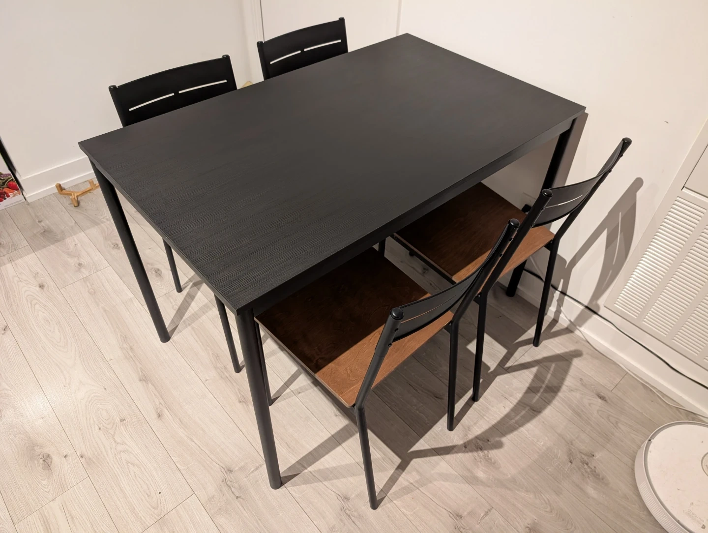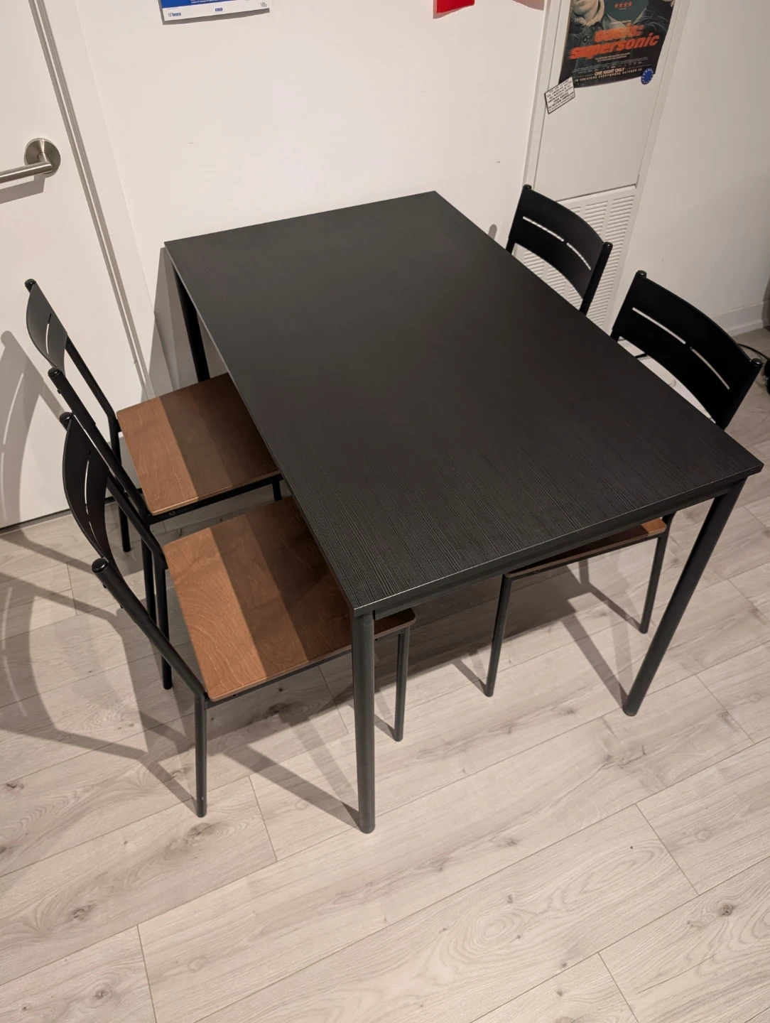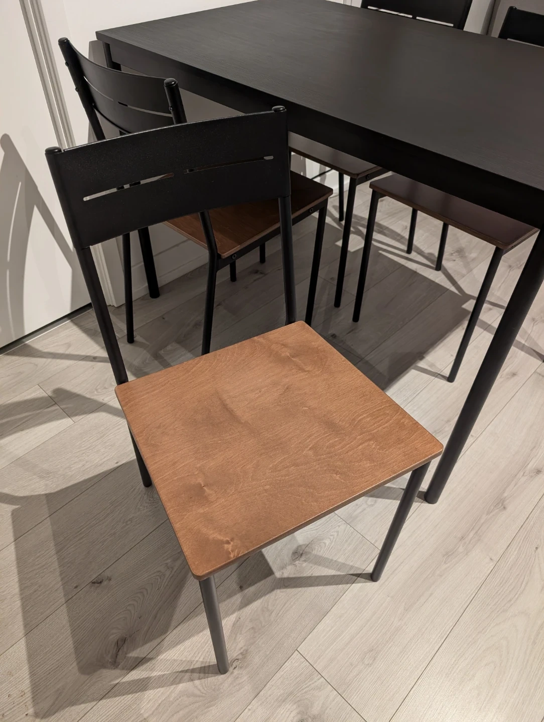 18Selling an IKEA dining table set with four matching chairs. The table measures 110 cm long, 67 cm wide, and 75 cm high. The set has a black metal frame and wooden seats and black tabletop. It’s in great shape. Works well for a small dining area, kitchen, or apartment. Pick up only at Yonge and Eglinton.