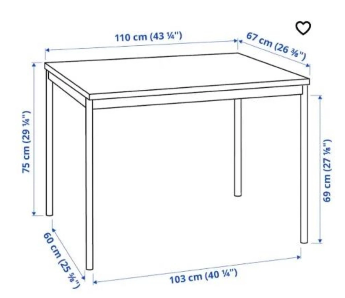 Looking to sell my IKEA dining set! The table is 110cm x 67cm. The chairs are 47cm wide and 79cm tall. Great for a smaller space or apartment