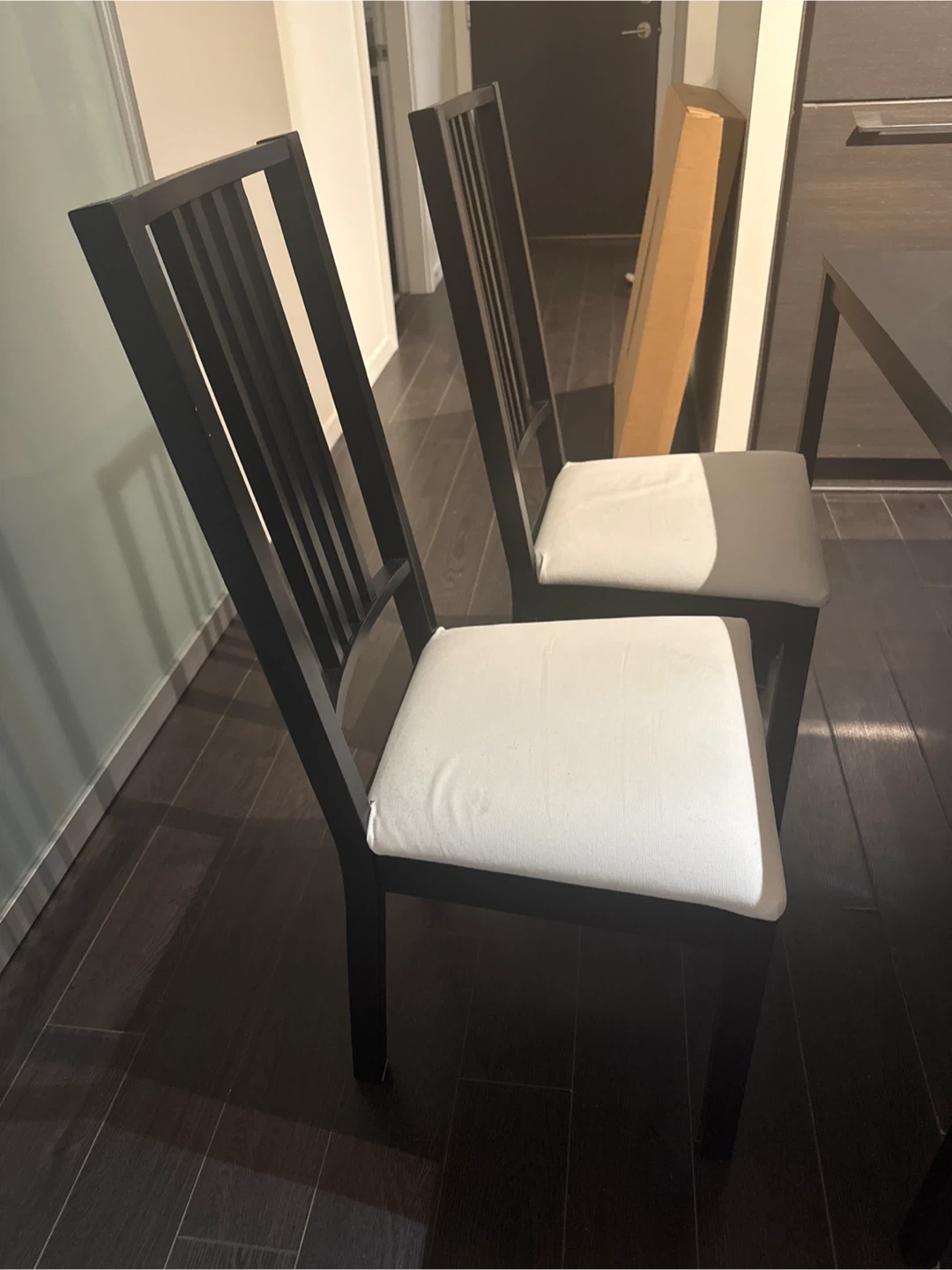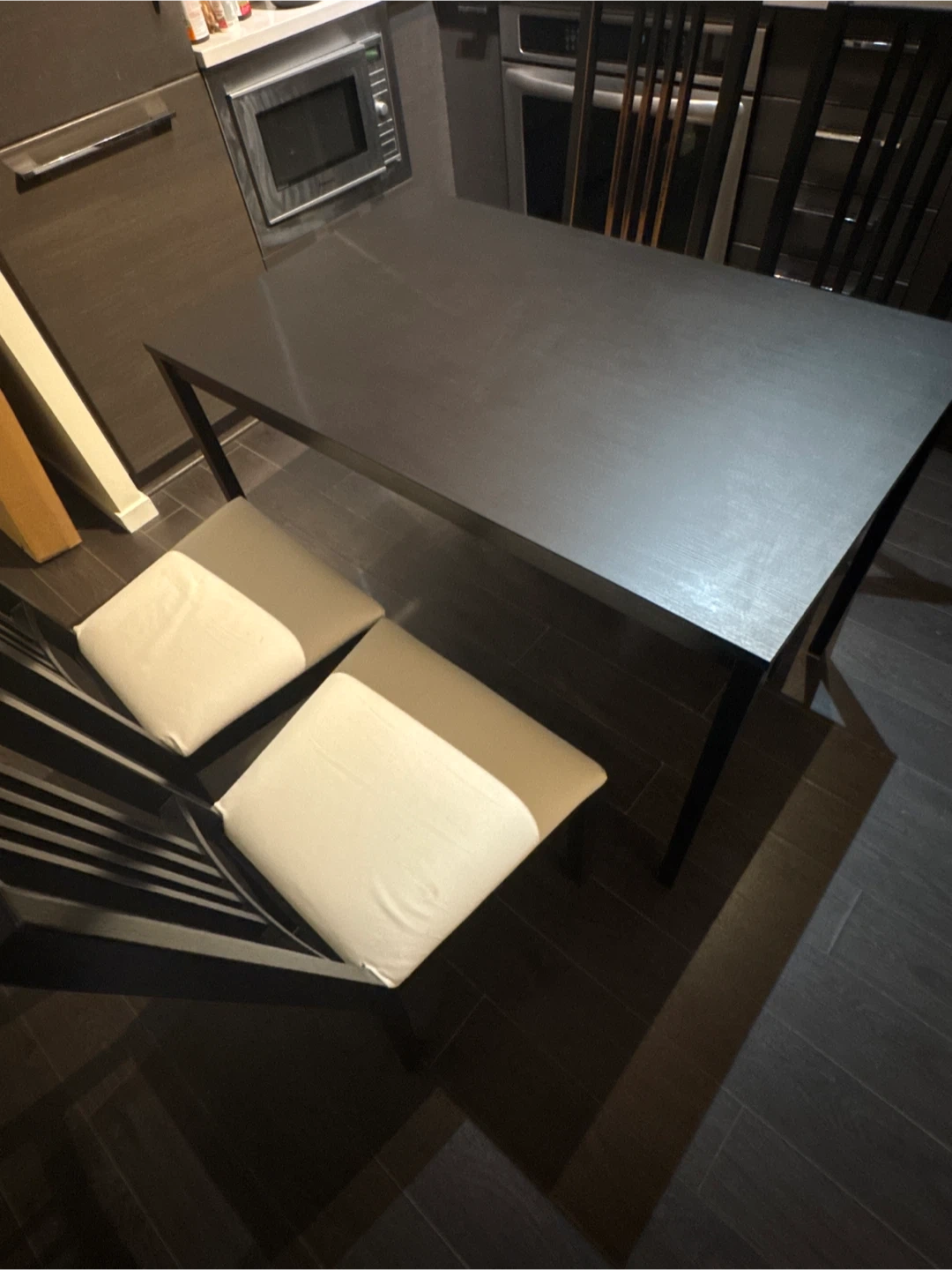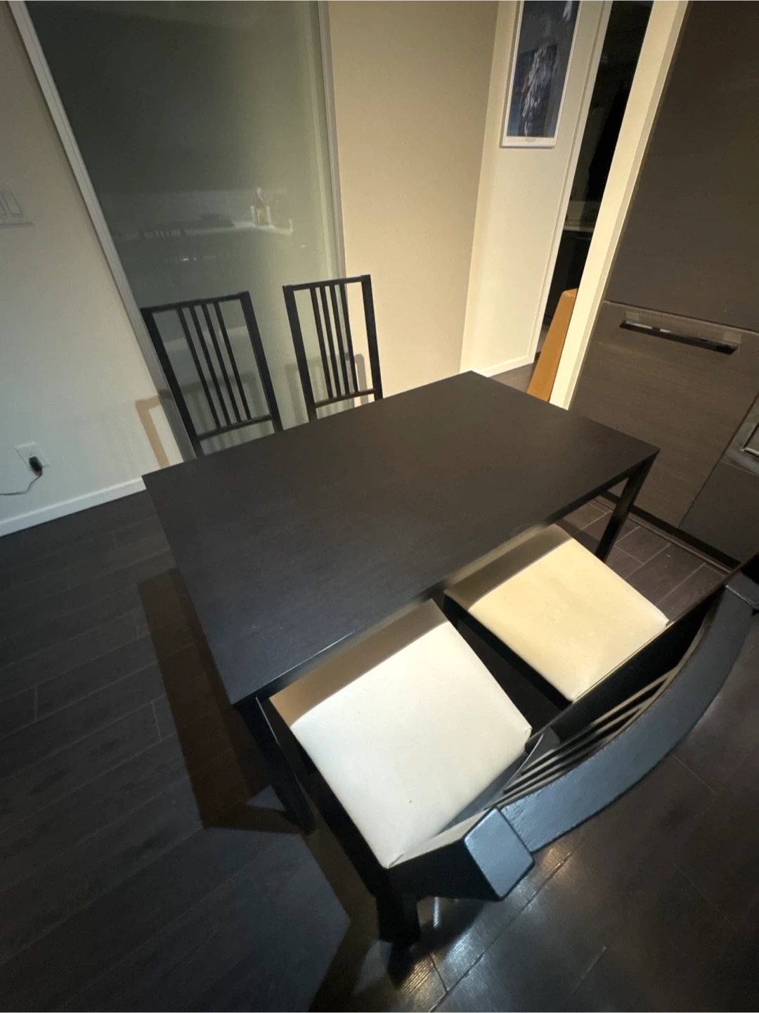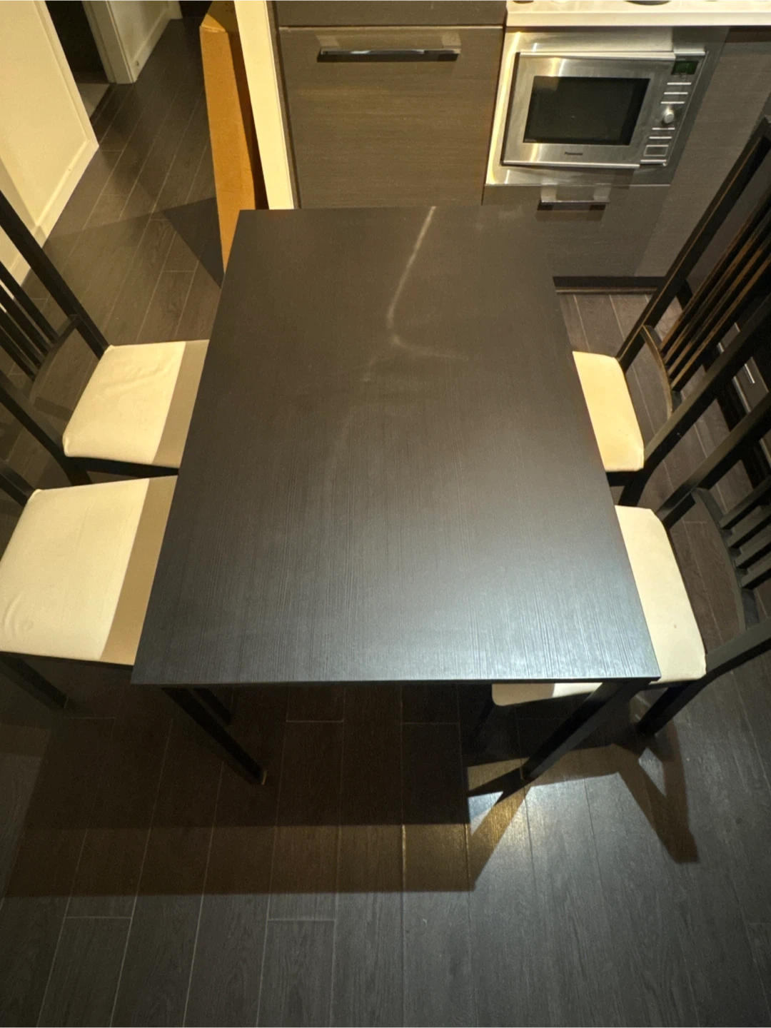152Giving out a dining table set from IKEA, which includes a table and four chairs. The chairs have light-coloured cushions, and the table has a dark finish. Whoever is interested needs to pick it up in location.