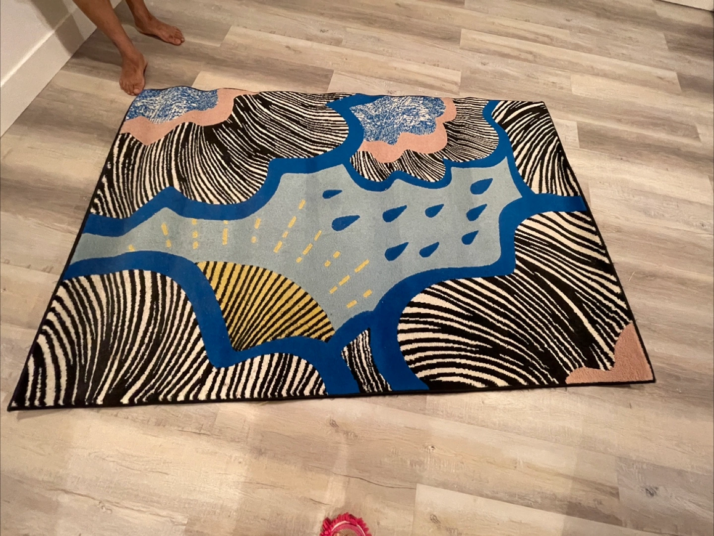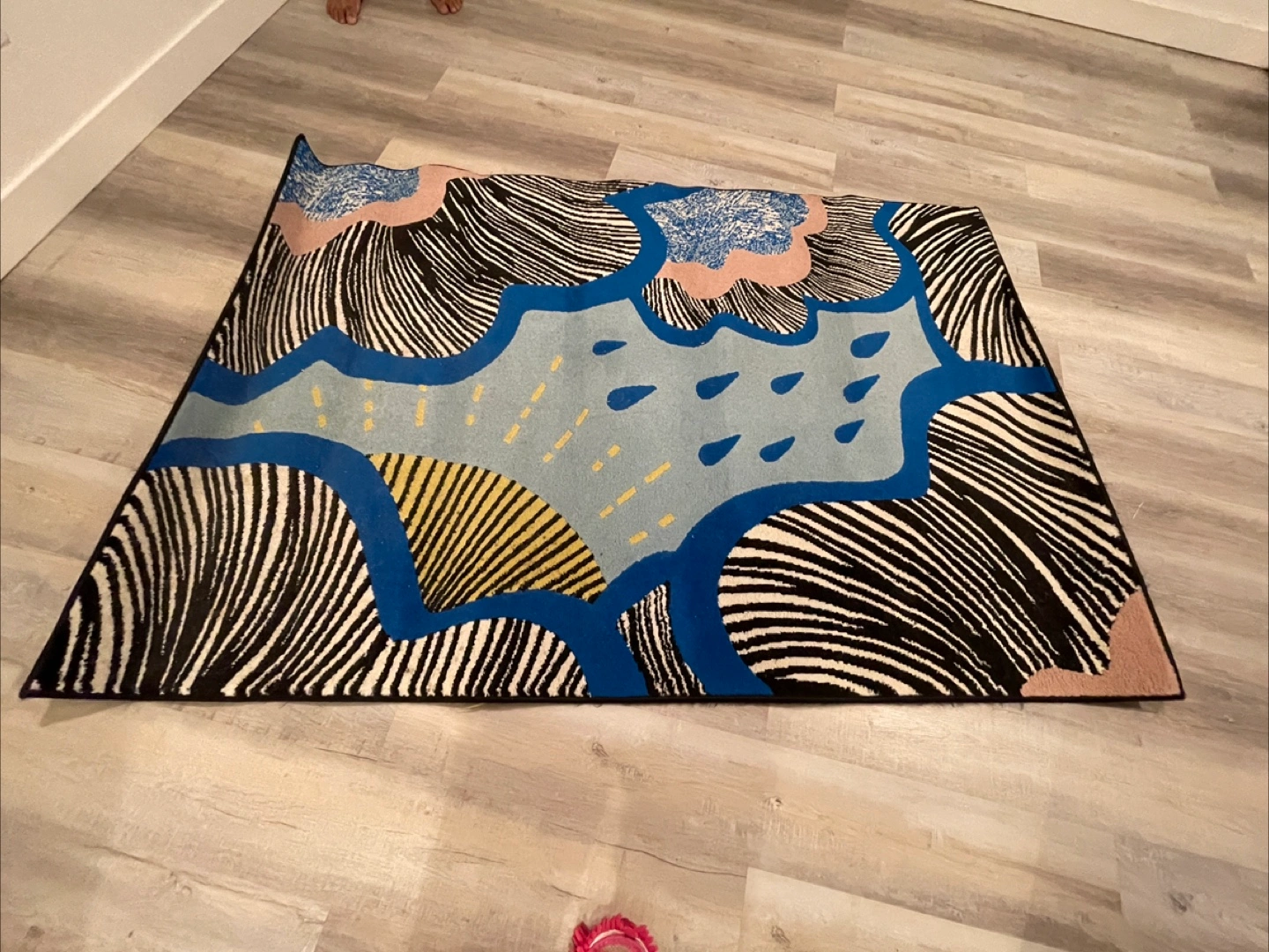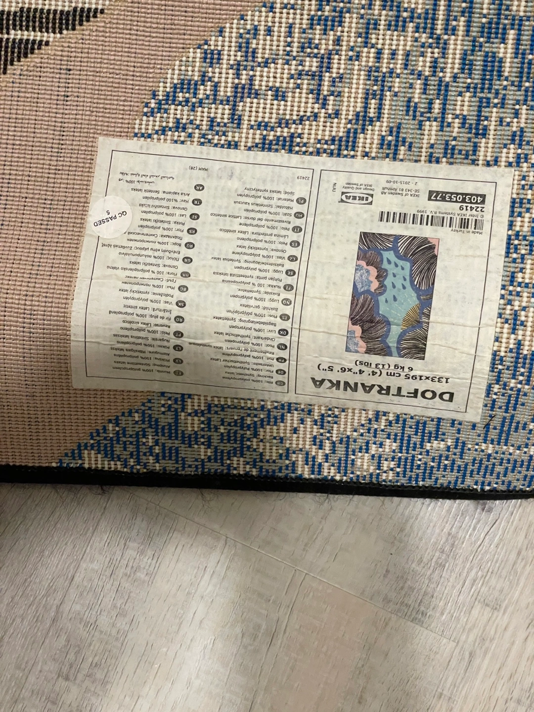 78IKEA Doftranka Rug (4'4"x6'5") .Selling an IKEA Doftranka rug in great condition! It features a unique pattern with black and white stripes, blue accents, and a touch of yellow. The rug measures 131x195 cm (4'4"x6'5") and is made of 100% polypropylene