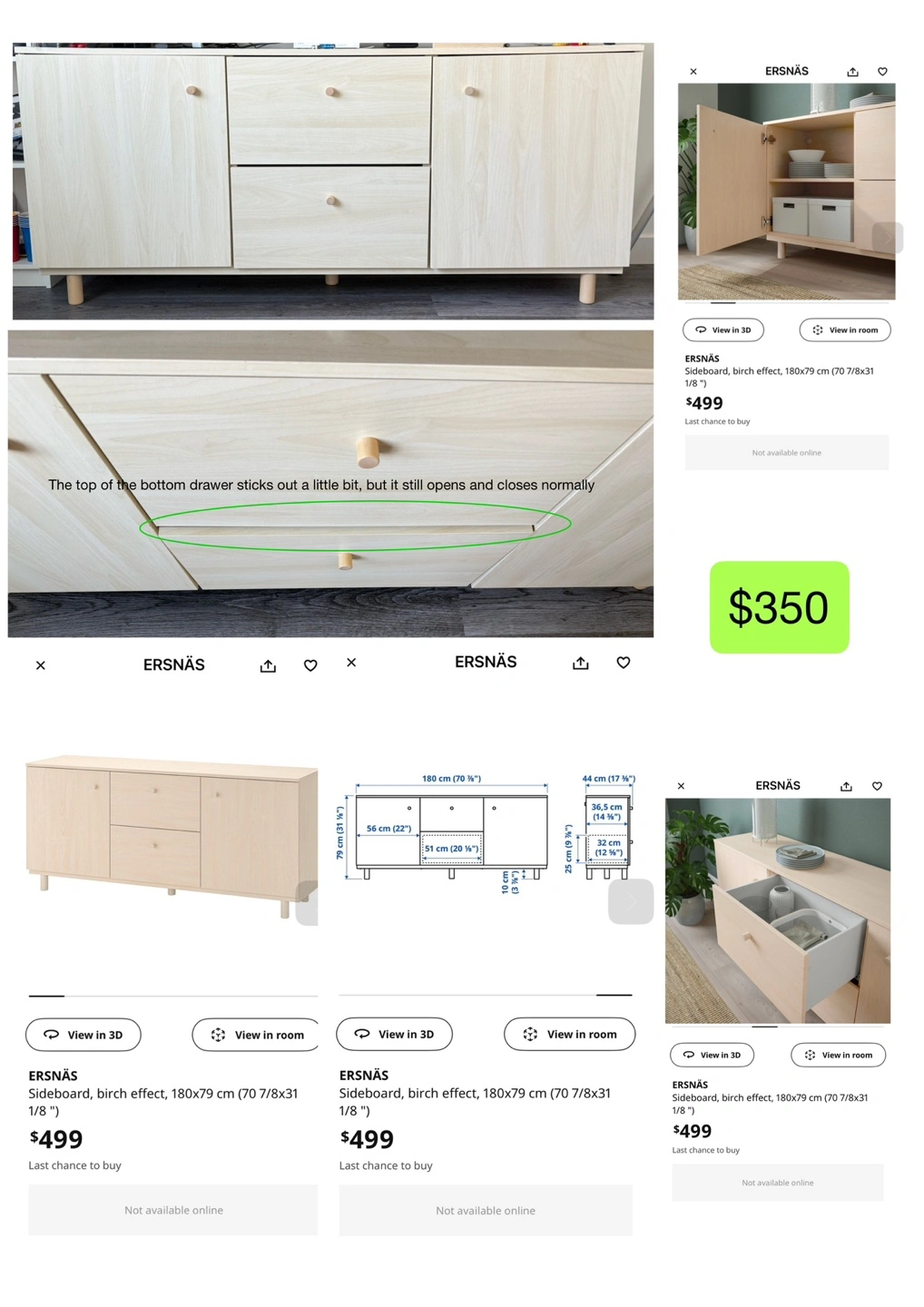 18Selling an IKEA ERSNÄS sideboard in birch effect. It measures 180x79 cm (70 7/8x31 1/8 "). There's a slight issue with the bottom drawer, as the top sticks out a bit, but it still opens and closes normally. Originally bought for $499.