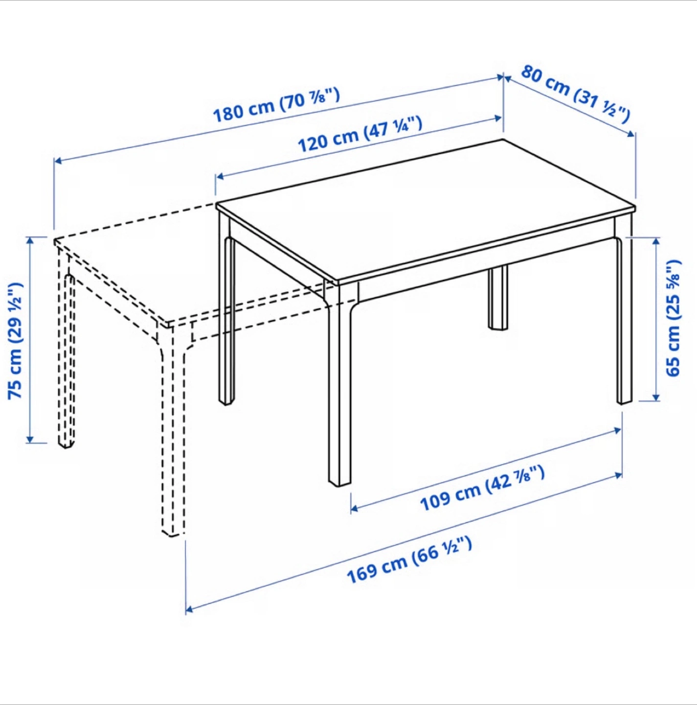 62This table is perfect for small spaces and can be extended when you have guests! Key specifications: - Dimensions: 180 cm (70 7/8 ") x 80 cm (31 1/2 ") when extended, 120 cm (47 1/4 ") x 80 cm when not extended - Height: 75 cm (29 1/2 ") - Material: Wood