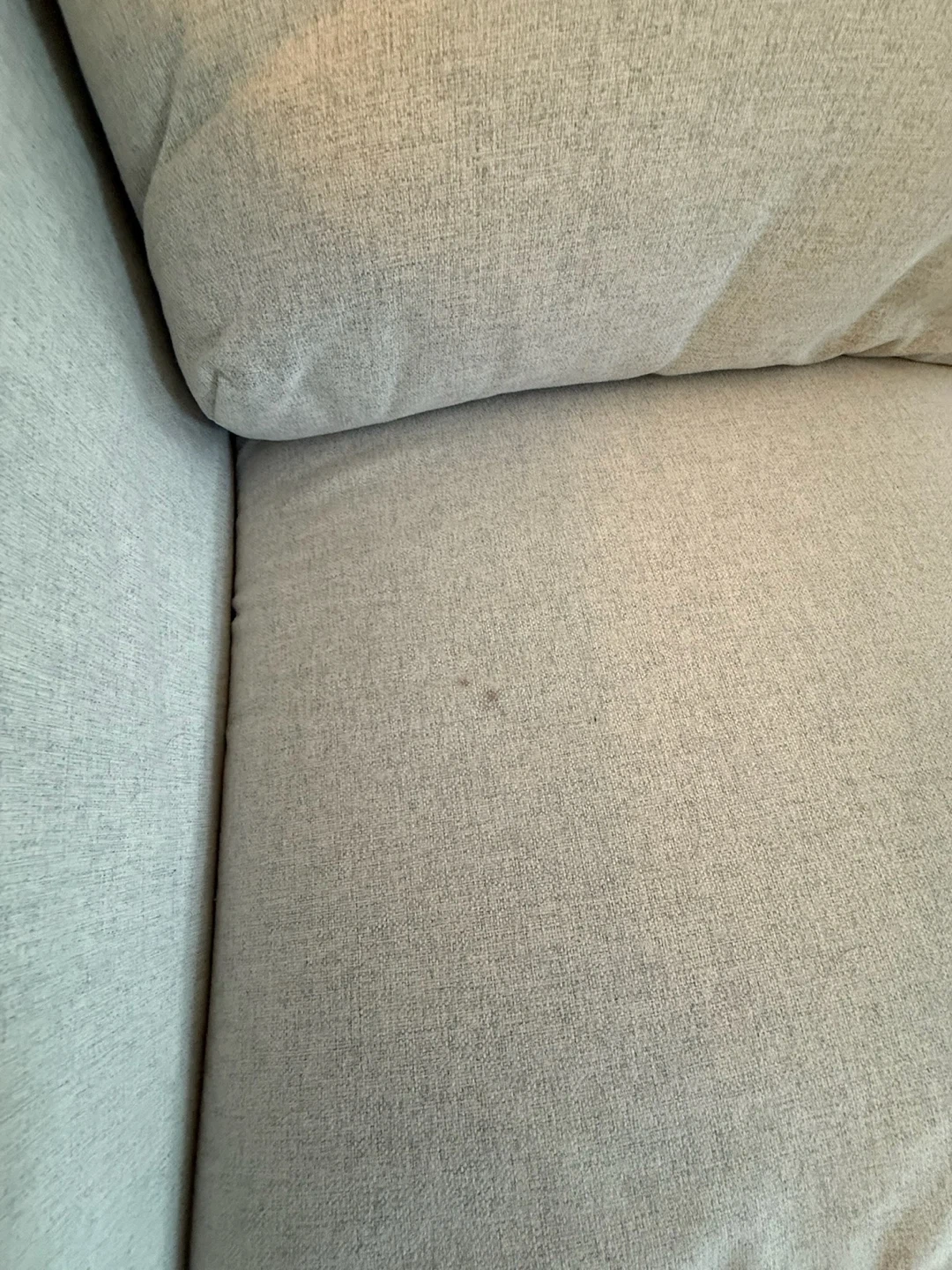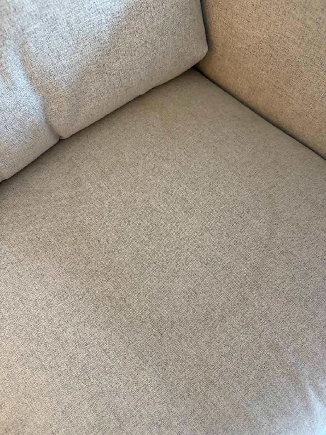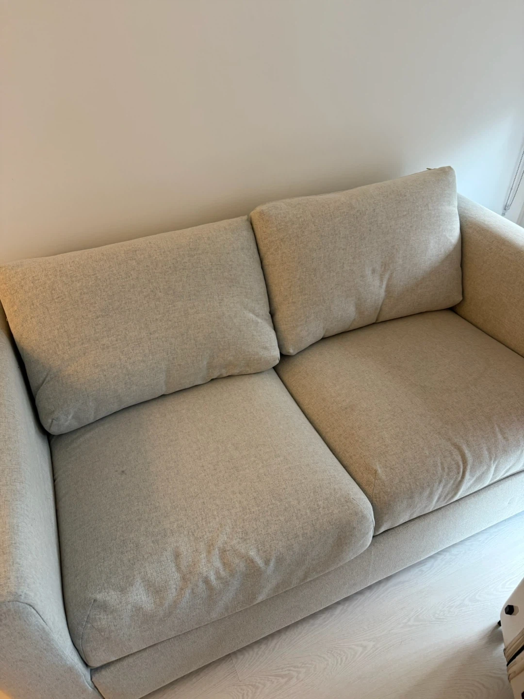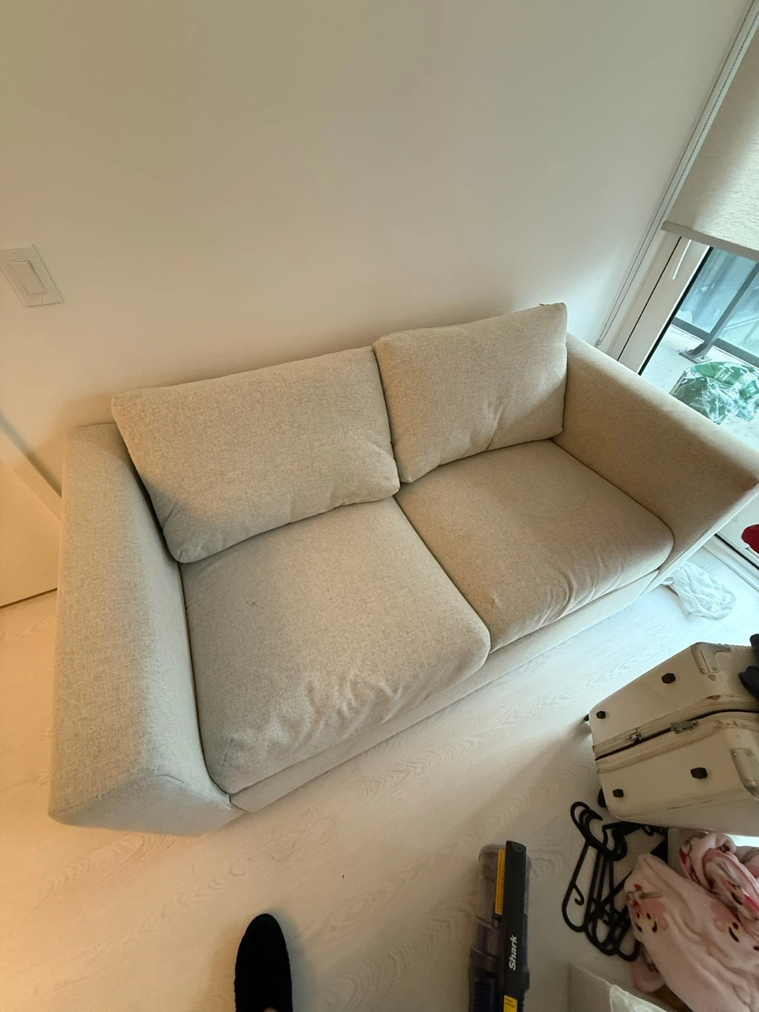 15This sofa is in great condition overall — no damage or tears. There are a few small stains on the seat cushions (as shown in the photos), but the rest of the sofa is clean and well-maintained. • Light beige fabric • Comfortable and sturdy • Smoke-free and pet-free home • Pickup only