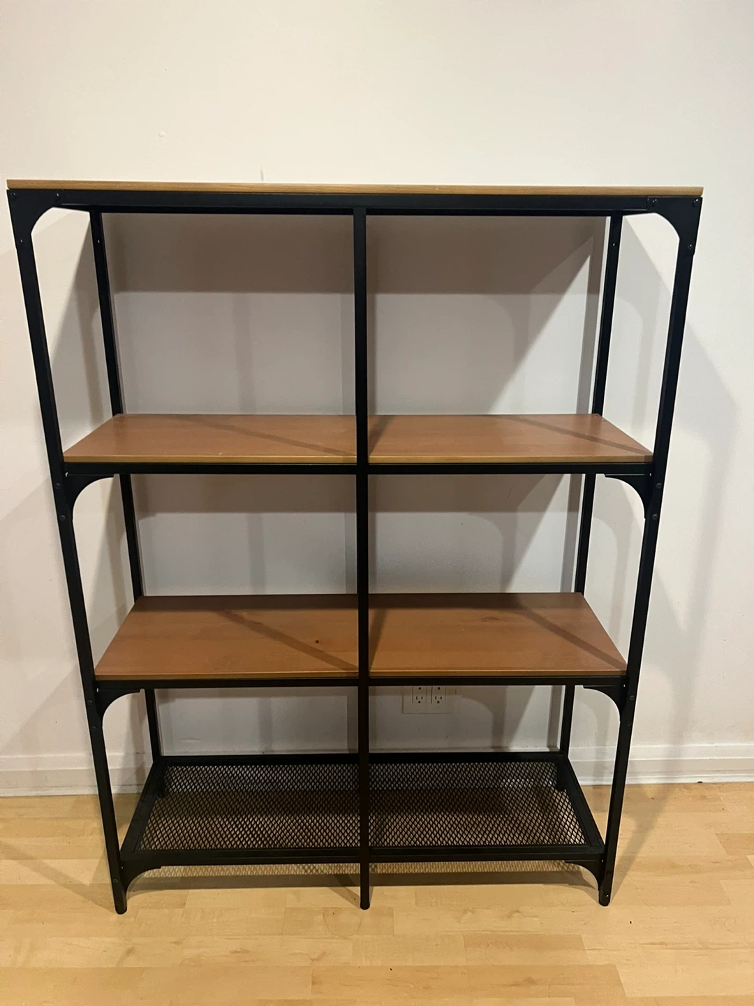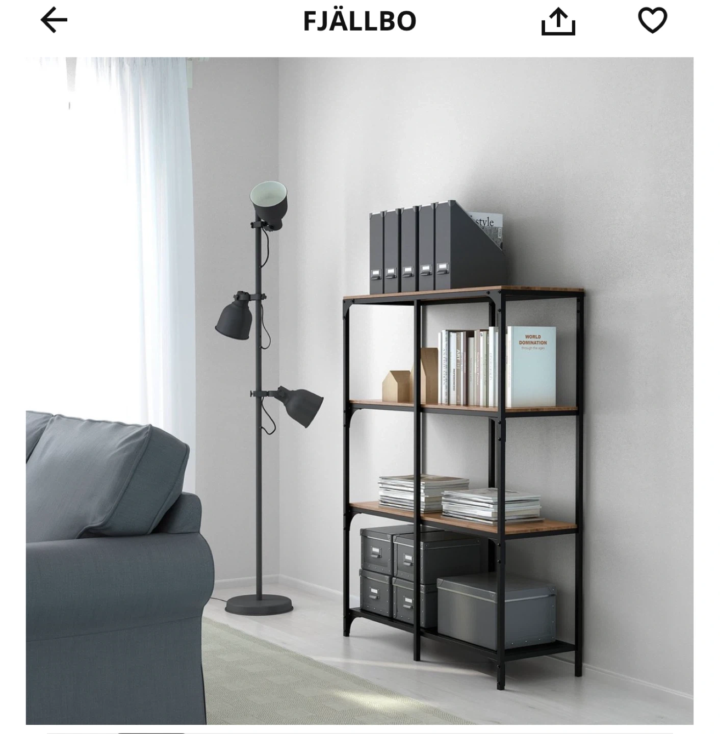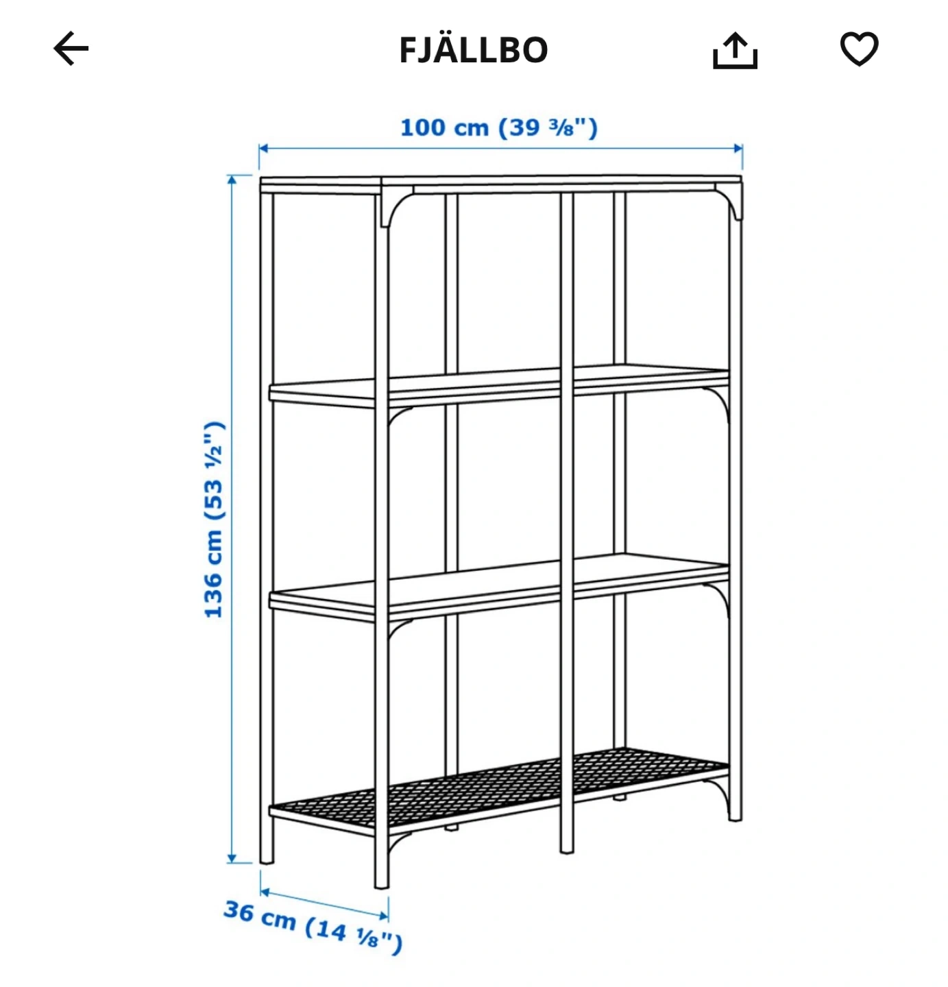 Selling an IKEA FJÄLLBO shelf unit in great condition! It features a black metal frame with wood-look shelves. Dimensions: - Width: 100 cm (39 3/8") - Depth: 36 cm (14 1/8") - Height: 136 cm (53 1/2")