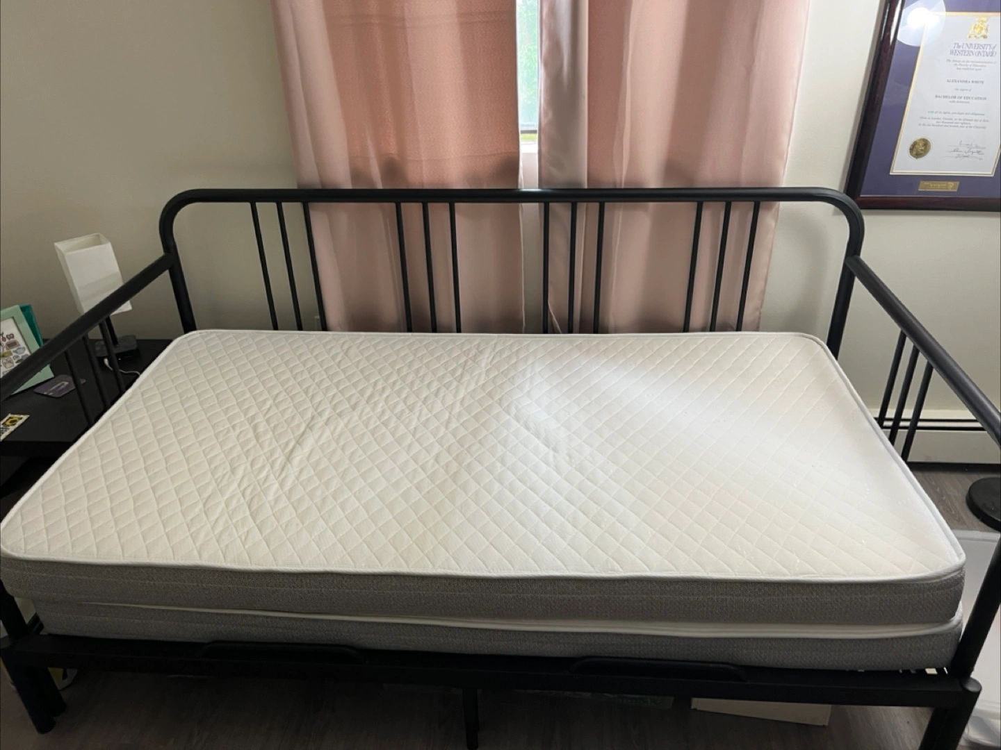 10IKEA Fyresdal pull-out daybed with two like-new mattresses. Twin when folded, queen when unfolded. Bed has been slept on less than 10 nights. Frame is disassembled, ready for pickup and all parts included. Instructions for reassembly can easily be found online. Pick up only! Cannot be delivered.