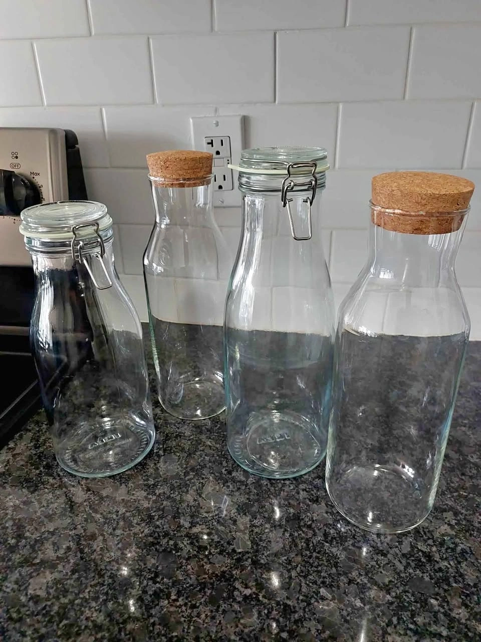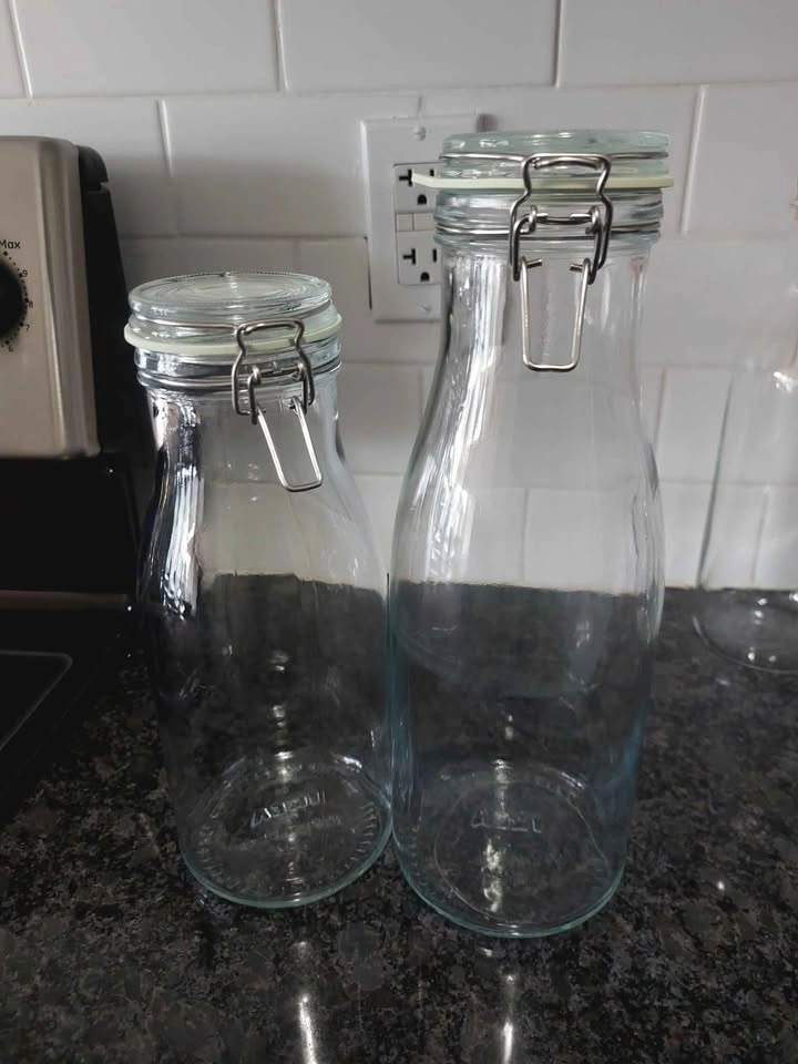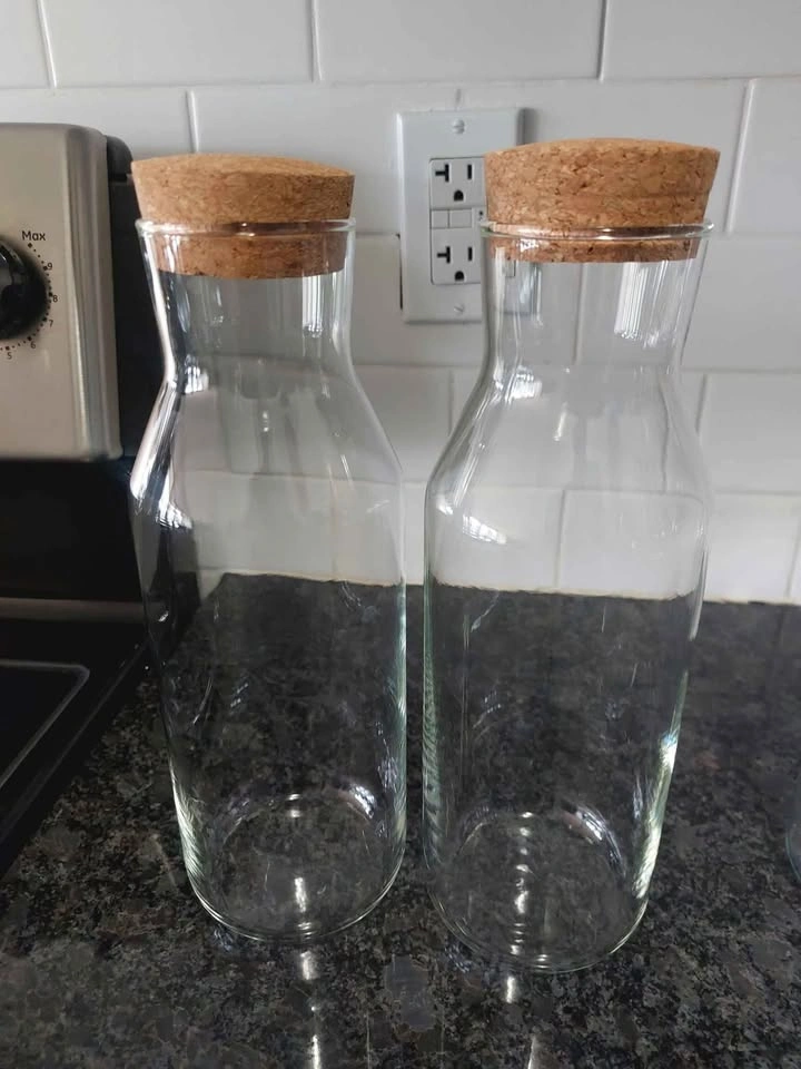 41Ikea Glass Bottles and Carafes 2 x 1L Glass Carafes with Cork Stoppers - Tempered Glass & Dishwasher Safe 1 x 1L Glass Bottle with Lid 1 x 1.4L Glass Bottle with Lid - Airtight, Leak proof & Dishwasher Safe Pickup near Keele and Finch Moving sale!! (Check out my other listings as well)