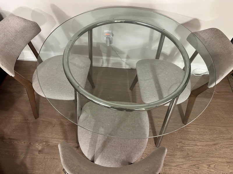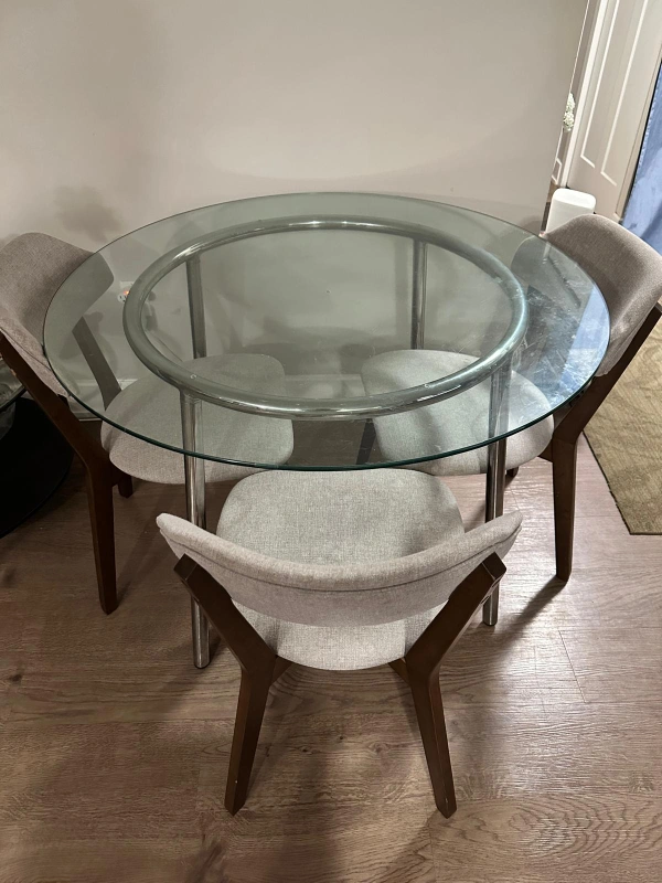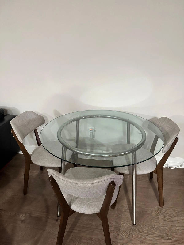 19IKEA Glass dining table with chrome base and fine quality chairs. Chairs have dark brown wooden legs and grey fabric seats. Pet/Smoke Free house. You can send your best offer. 250 OBO
