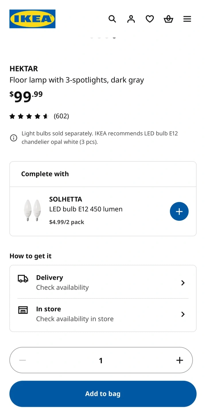 65Selling an IKEA Hektar floor lamp with 3 spotlights in dark grey. It's a stylish and functional piece for any room. Light bulbs sold separately; IKEA recommends LED bulb E12 chandelier opal white (3 pcs)