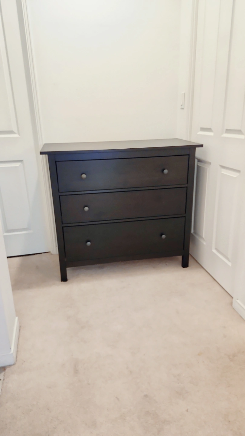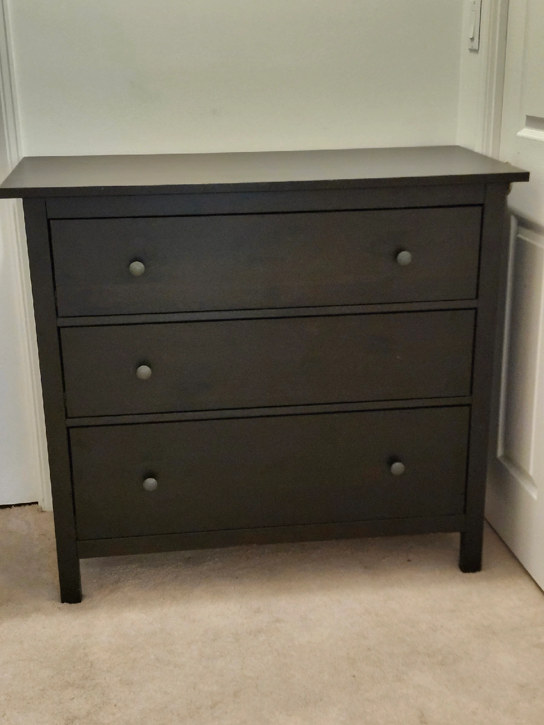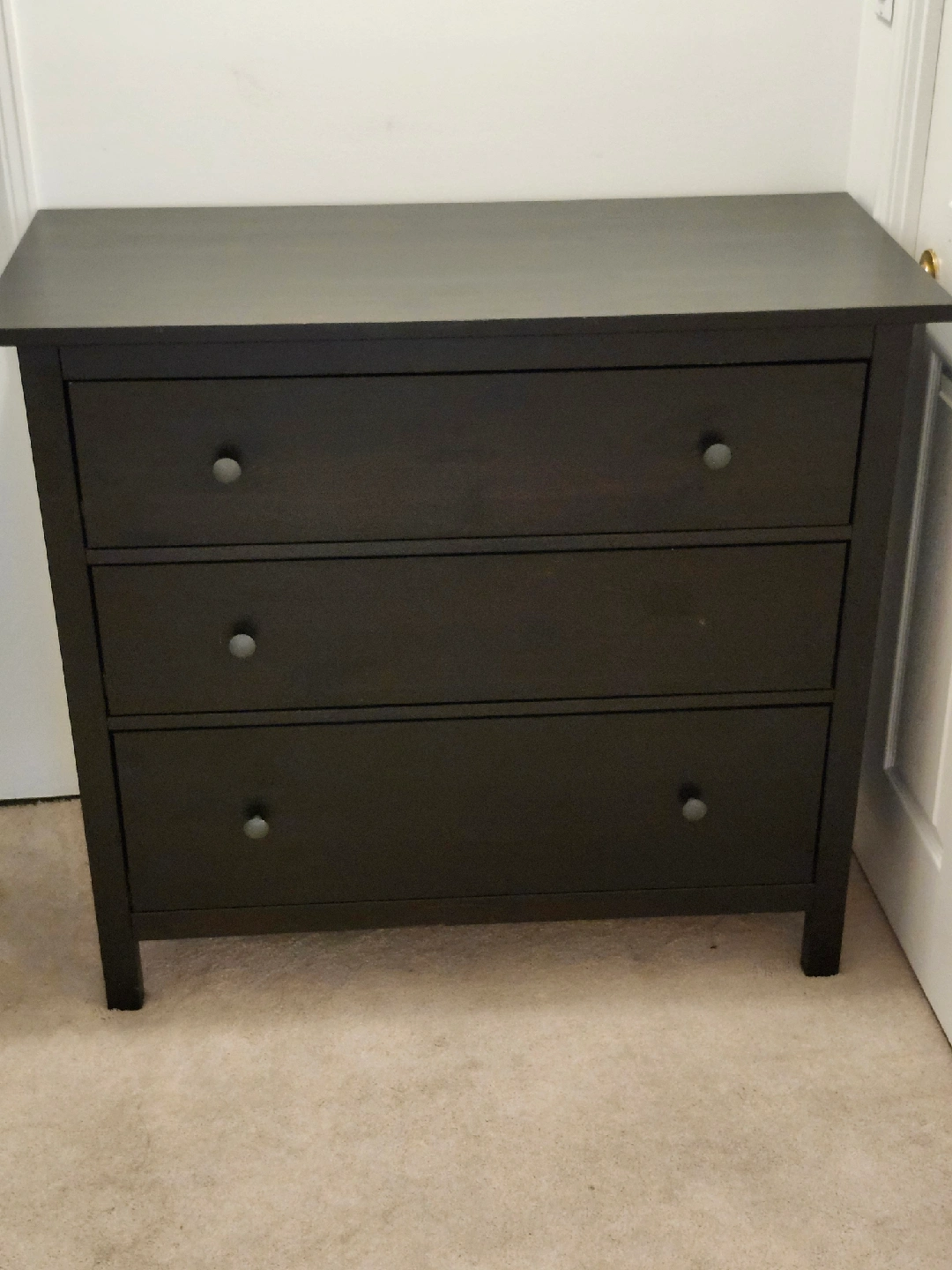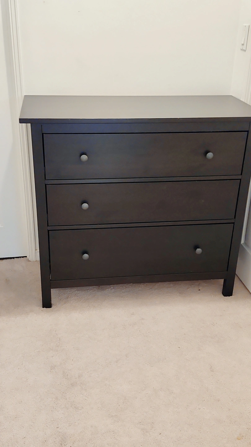 316like New IKEA Hemnes 3-drawer chest in black-brown! It's in great shape and ready for a new home. The dimensions Width: 42 1/2 " Depth: 19 5/8 " Height: 37 3/4 " Drawer depth (inside): 16 7/8 " Height under furniture: 4 3/8 " Storage capacity: 6.1 cu.ft Drawer pull-out: 9 7/8 Originally bought for $299.99+ Tax Moving Sale