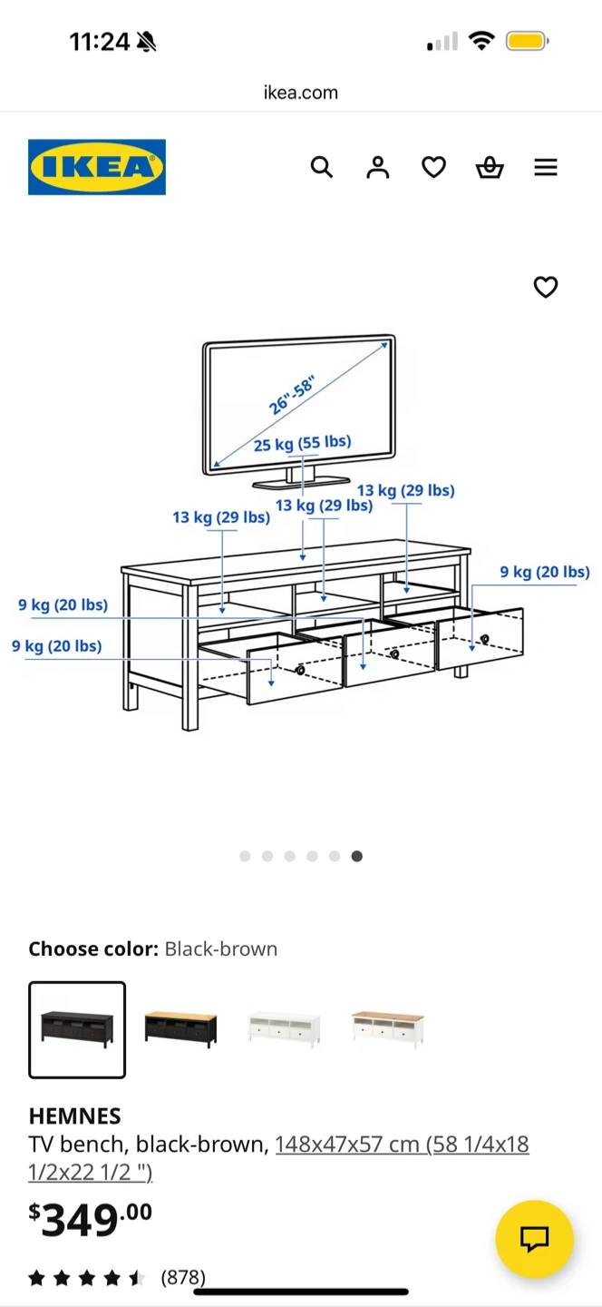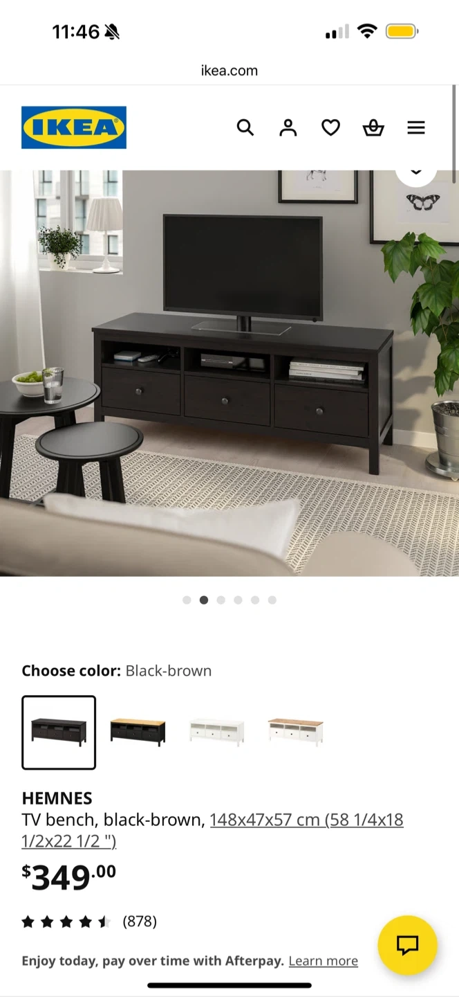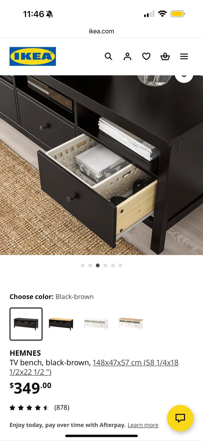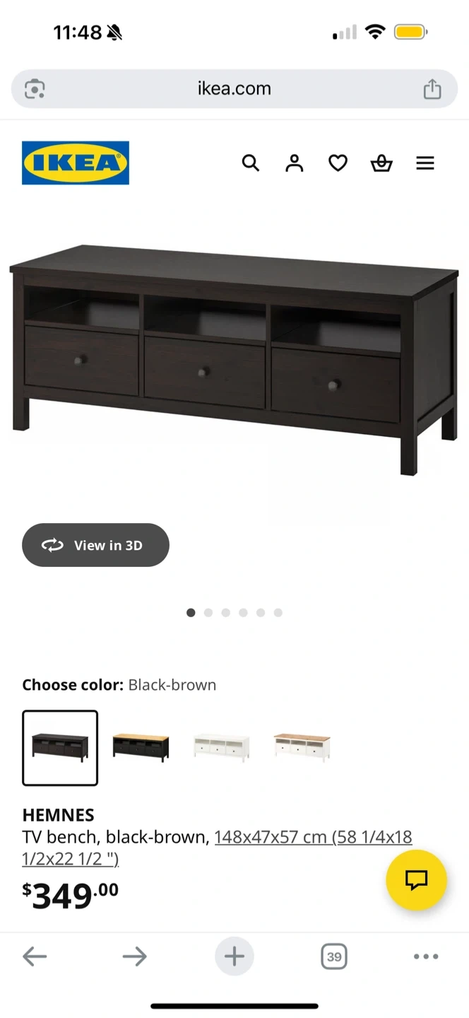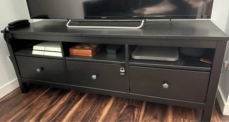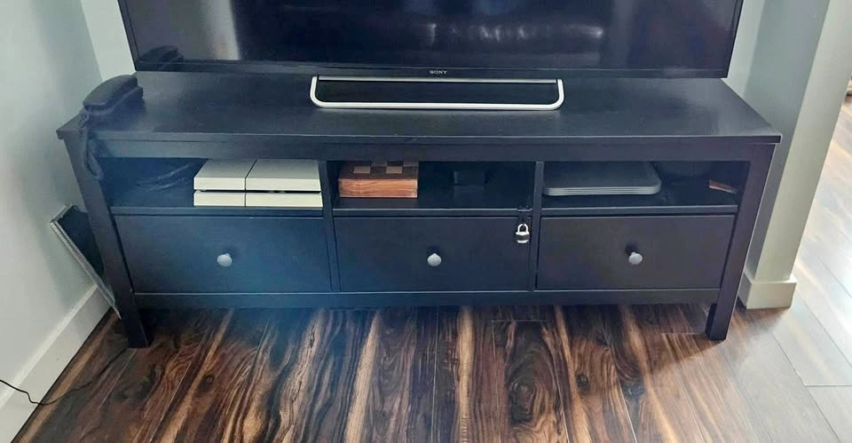 IKEA HEMNES TV Console / Bench (Black Brown) 3 drawers Made of solid wood Dimensions: Width: 148 cm (58 1/4 ") Depth: 47 cm (18 1/2 ") Height: 57 cm (22 1/2 ") In excellent, clean condition; no damages or issues Retails at IKEA for $349 + tax = $391 Installed a lock on one of the drawers which will be removed before pick-up Must be able to arrange own transportation for pick-up Pick-up in Yaletown