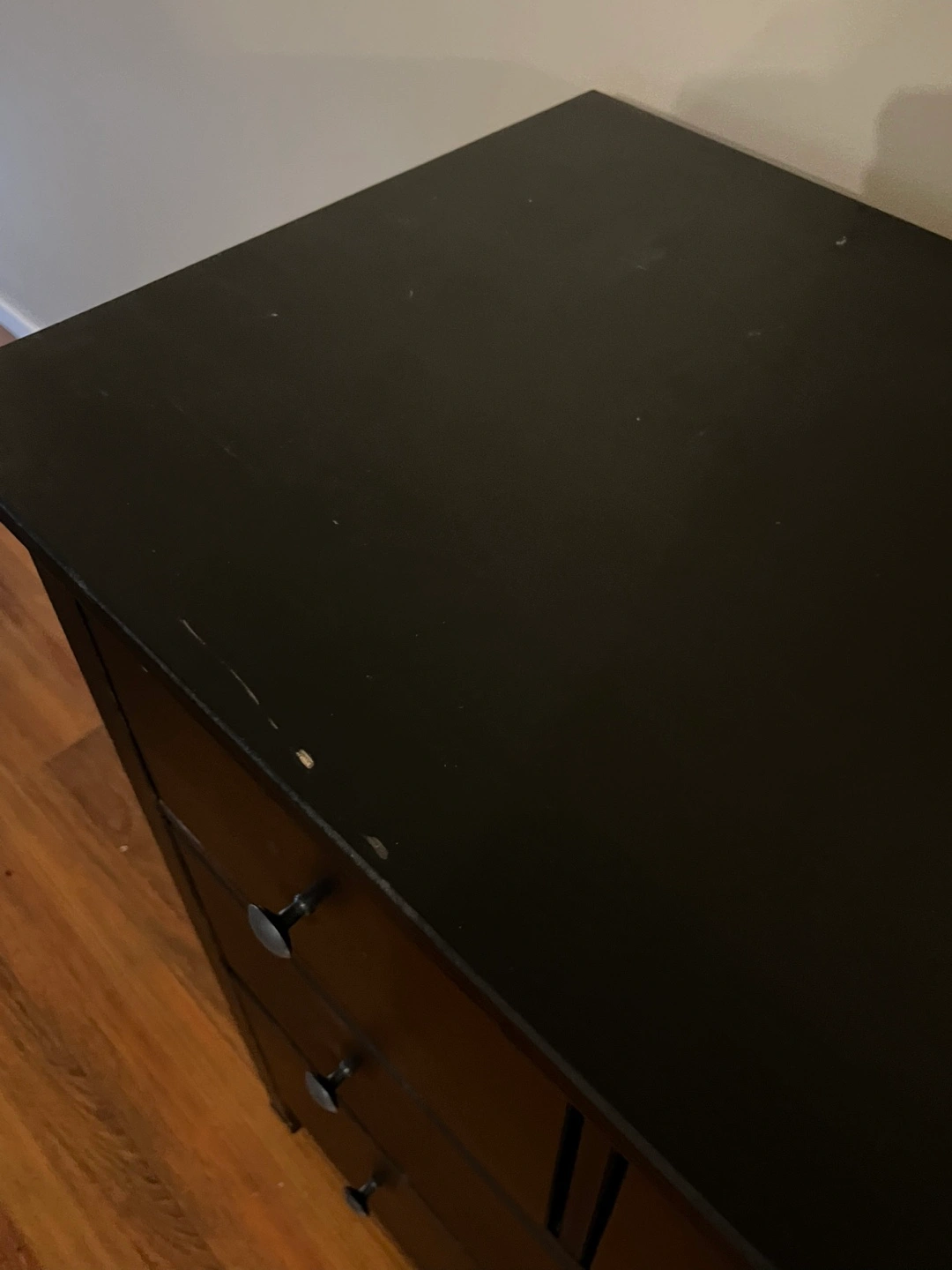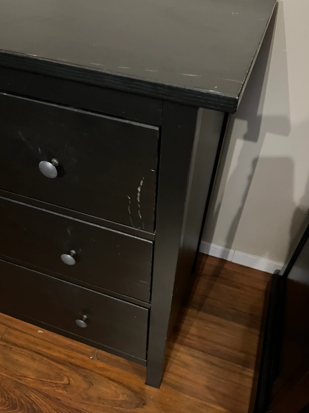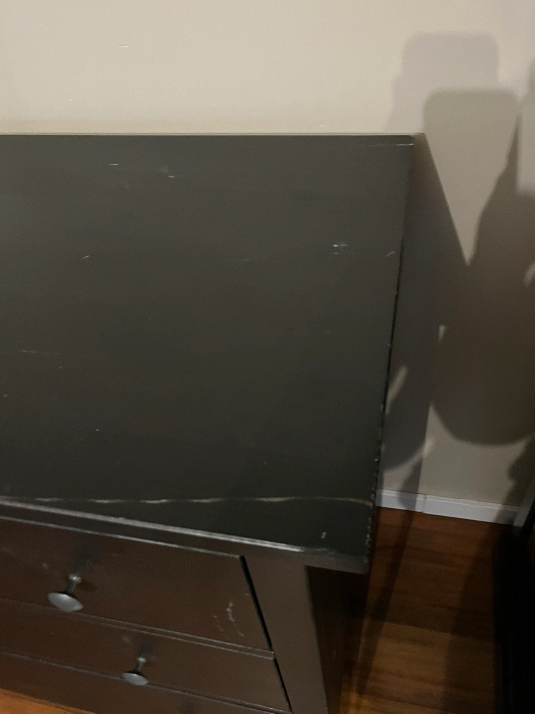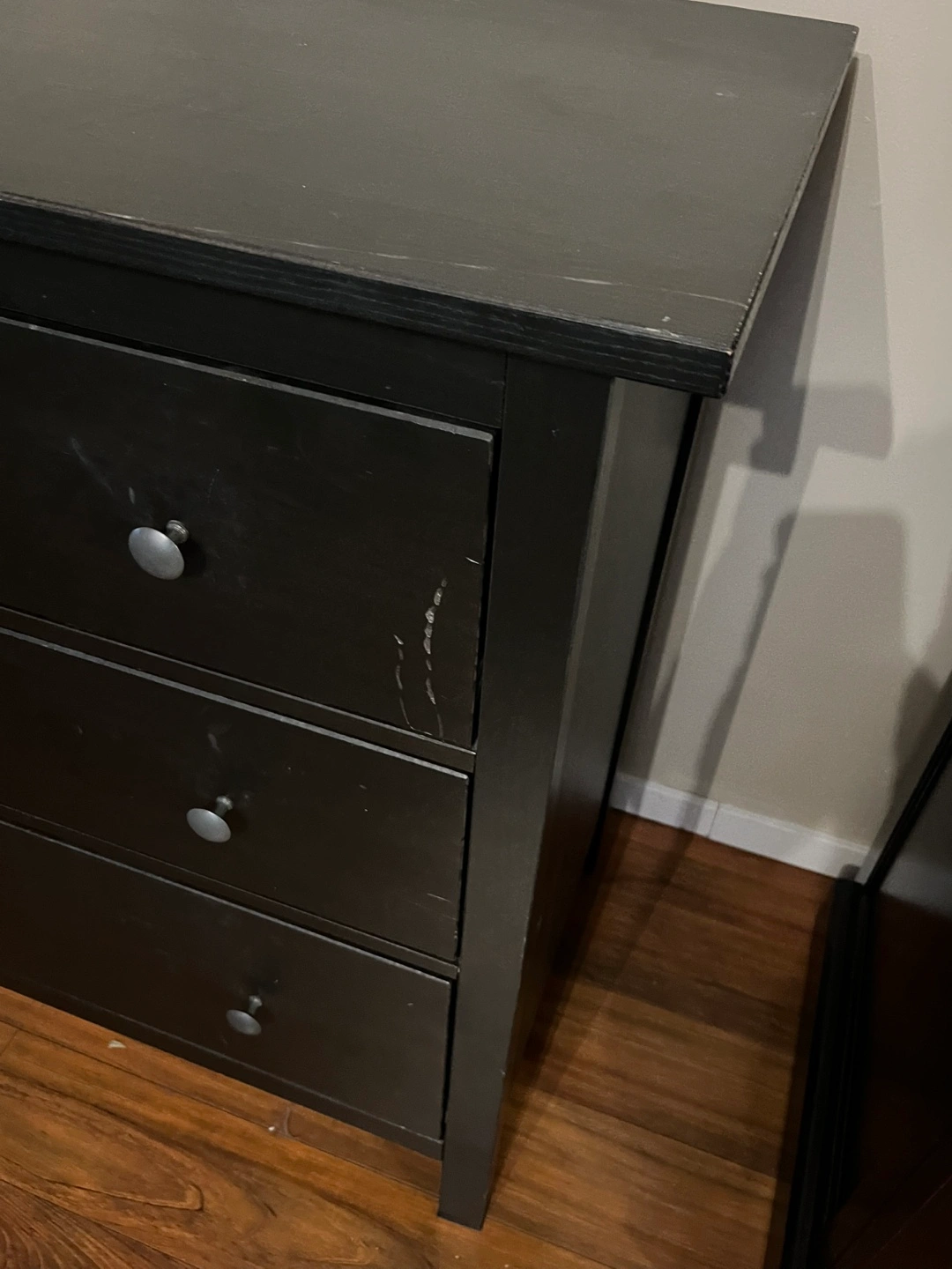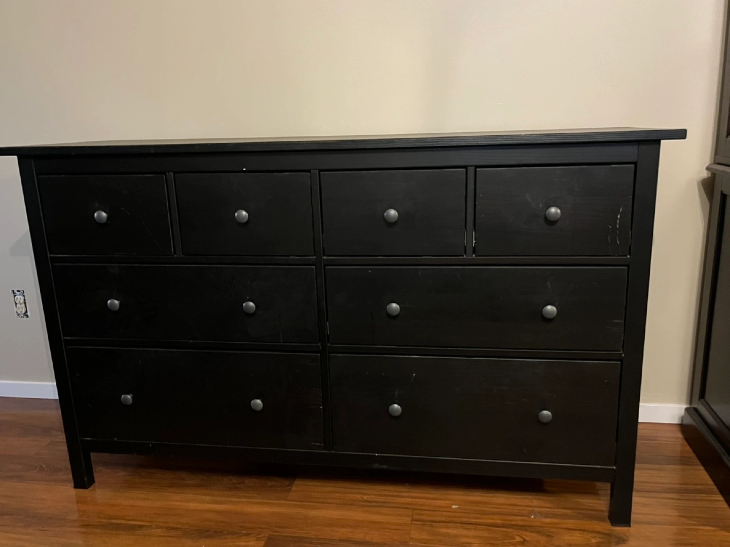 Eight-drawer dresser. Black-brown colour. Some minor scratches and wear. Solid wood construction. Good storage solution. Drawers slide well, no issues there. Scratches could be easily hid my wood crayon, marker. Non smoking, pet friendly South Burnaby location. Check out my other listings!