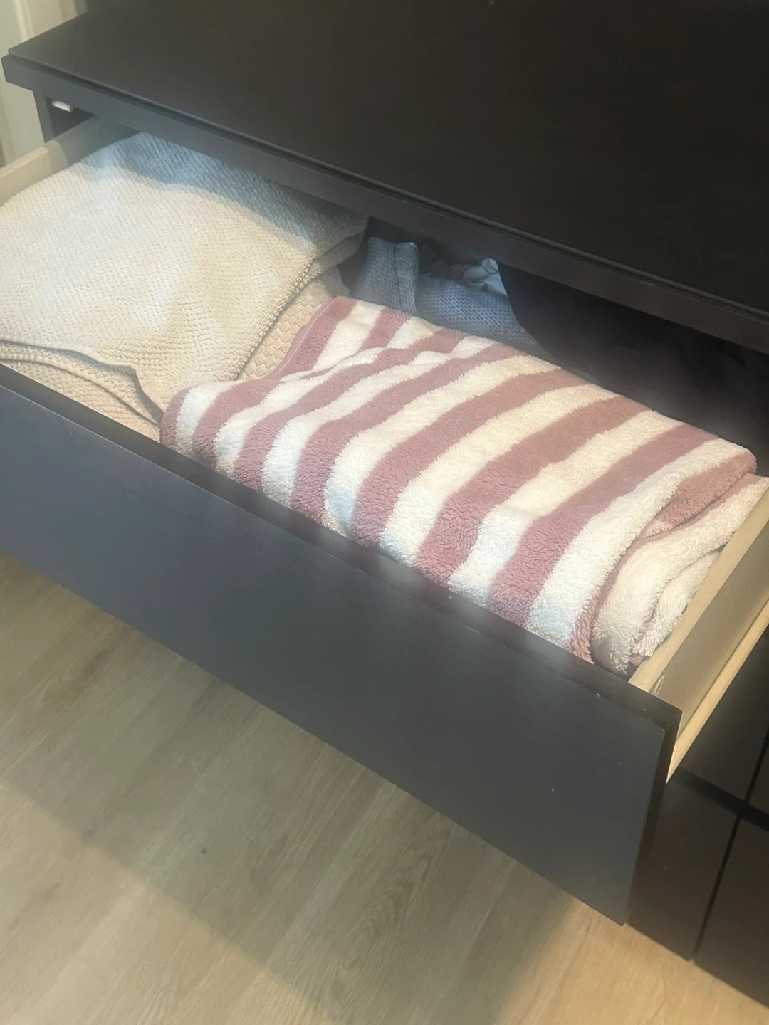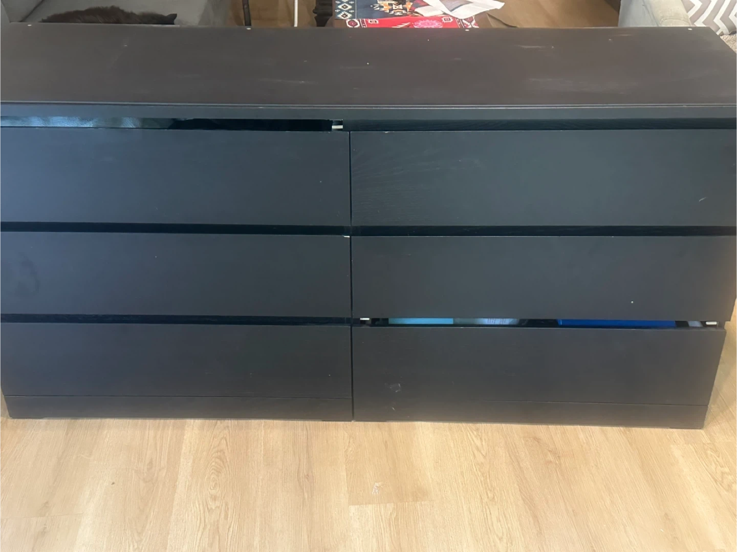 Selling a used IKEA Hemnes dresser in black It's a 6-drawer dresser, perfect for organizing clothes or other items. There are some signs of use, as shown in the pictures, but overall it's still in good condition. Great for adding storage to any bedroom!
