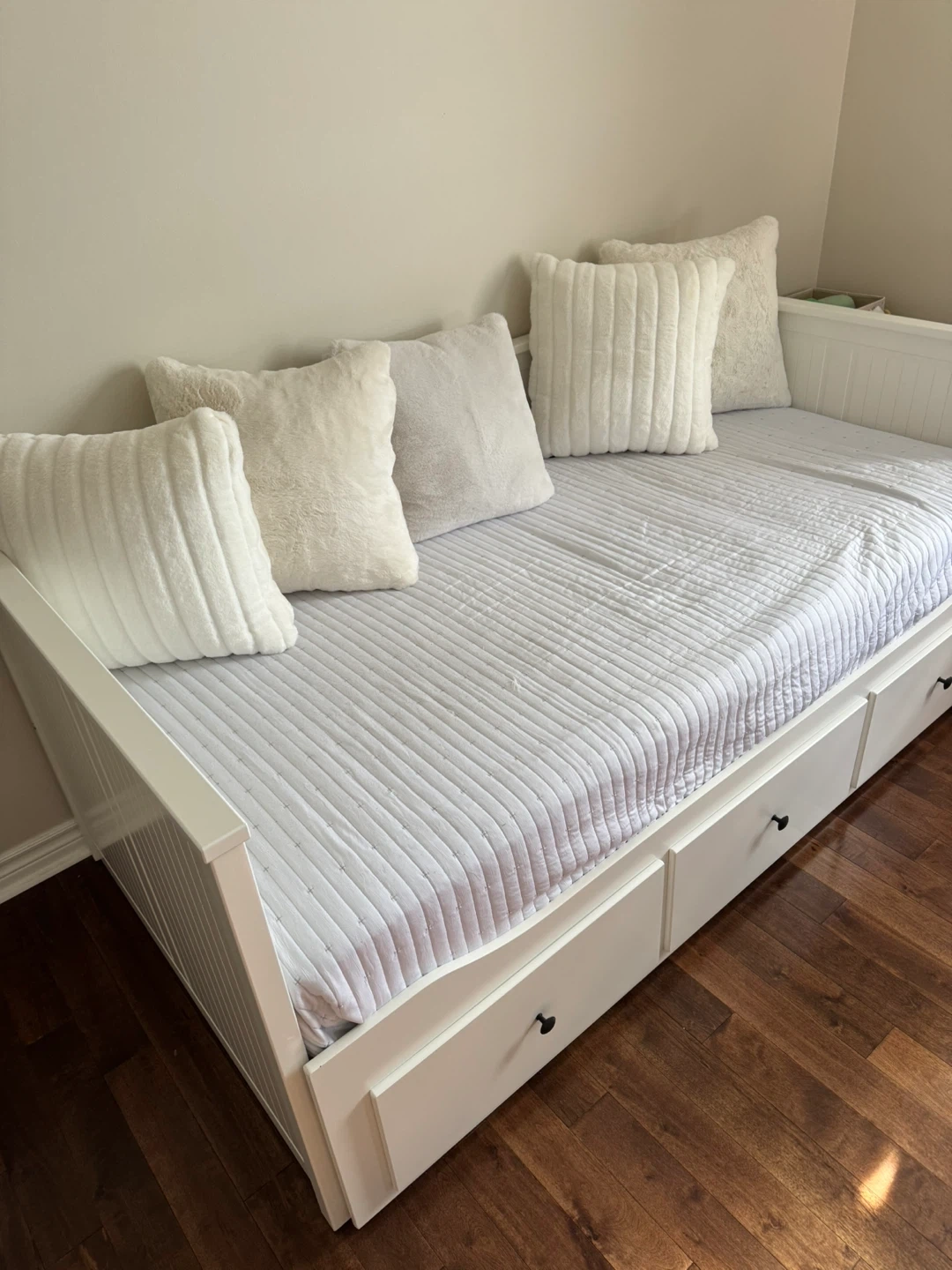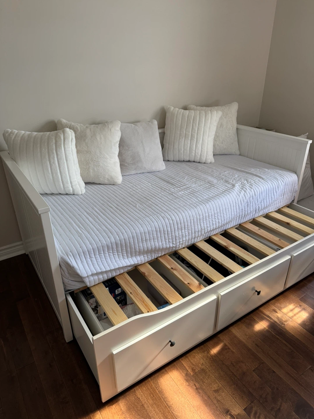 23Selling a gently used IKEA Hemnes daybed frame in white. It features three spacious drawers for storage and can be pulled out to create a double bed. Perfect for a guest room or a kid's room!