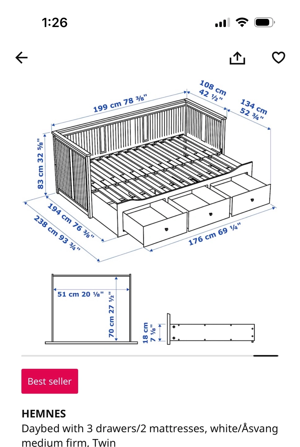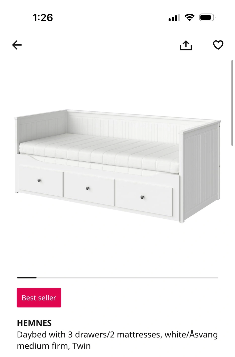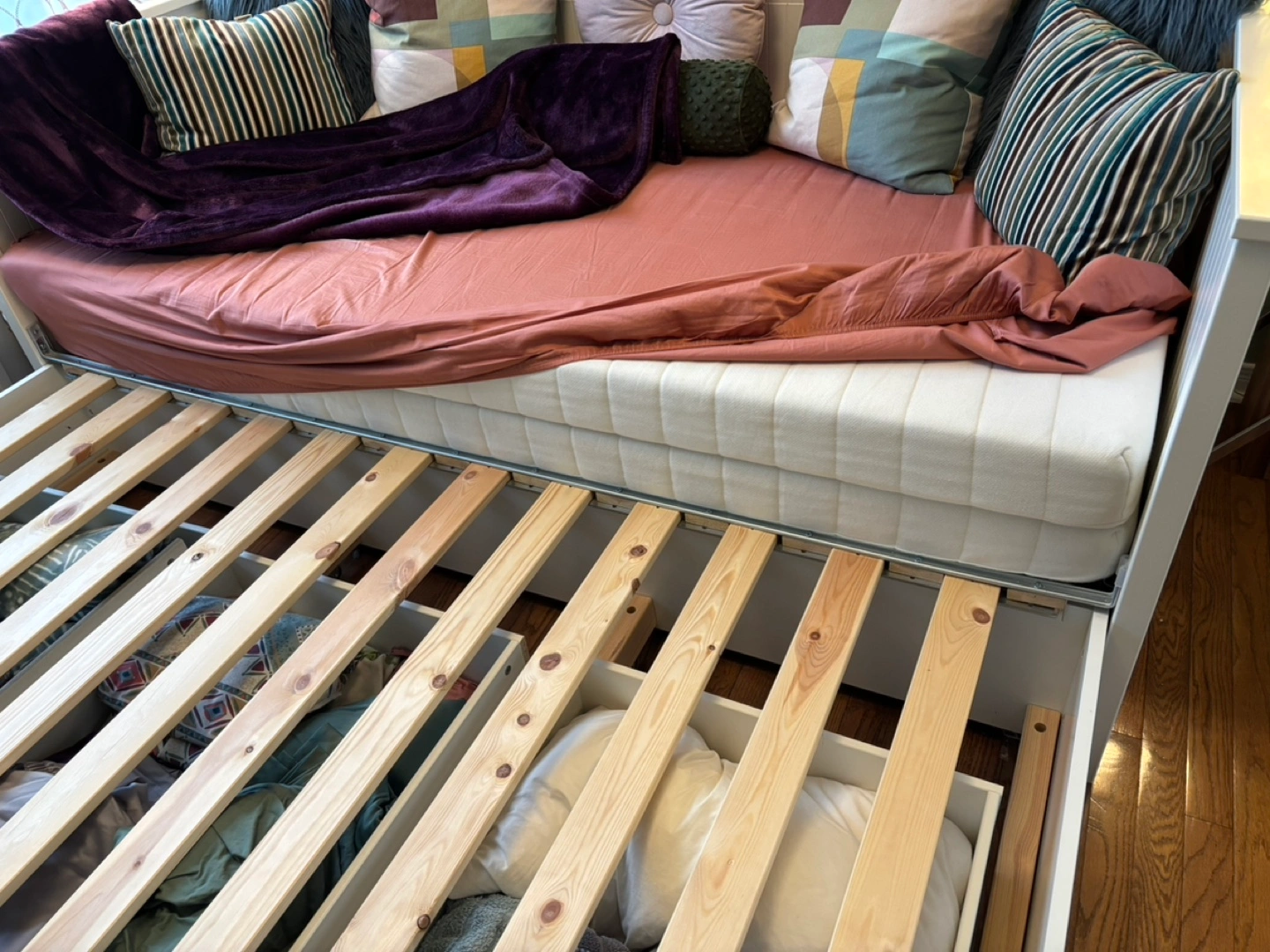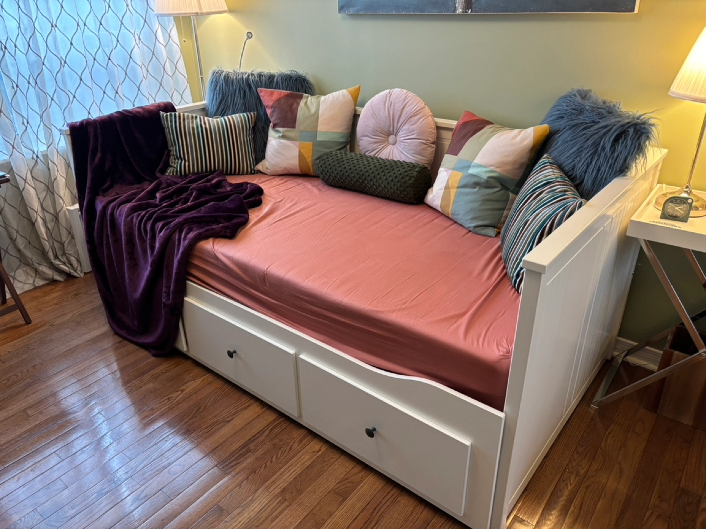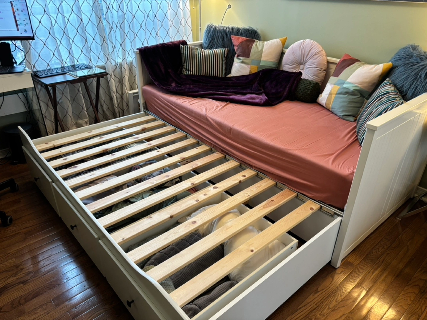 14White daybed with three drawers. Includes mattress. Twin size. Furnishings Not included (pillows, covers, blankets, cushions, etc) Perfect condition Pick up only, will help to disassemble