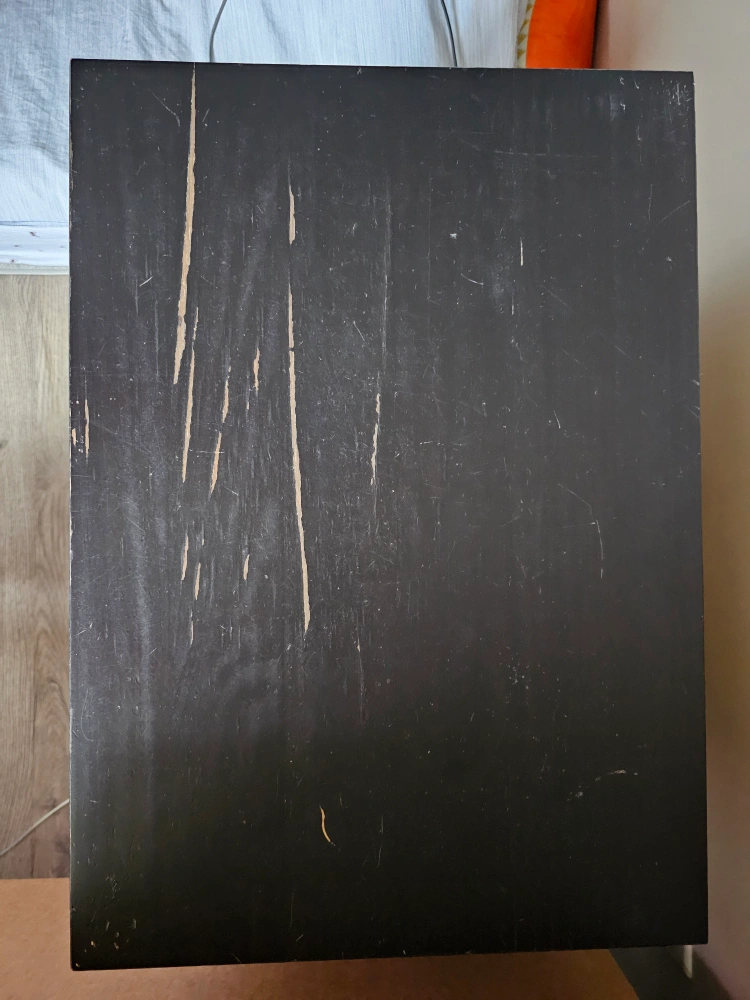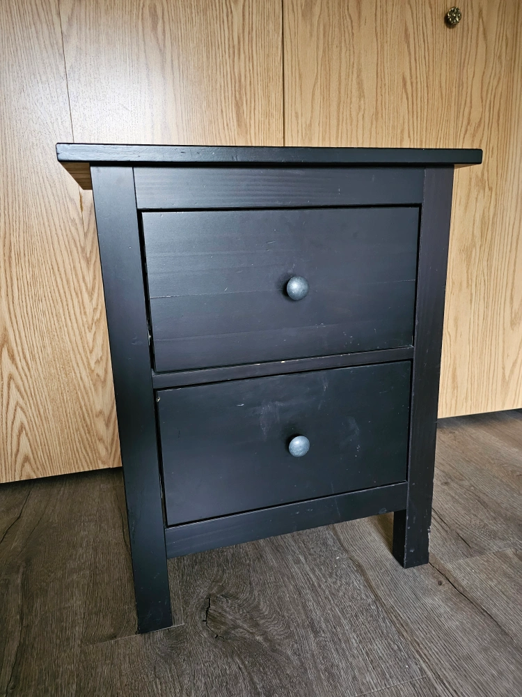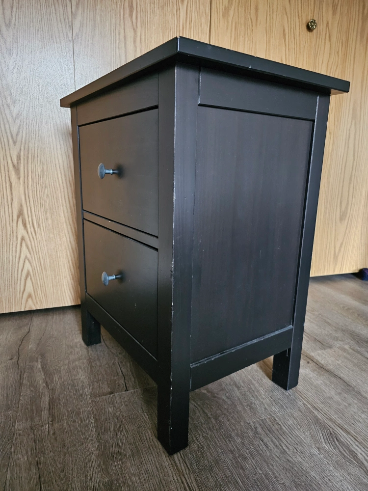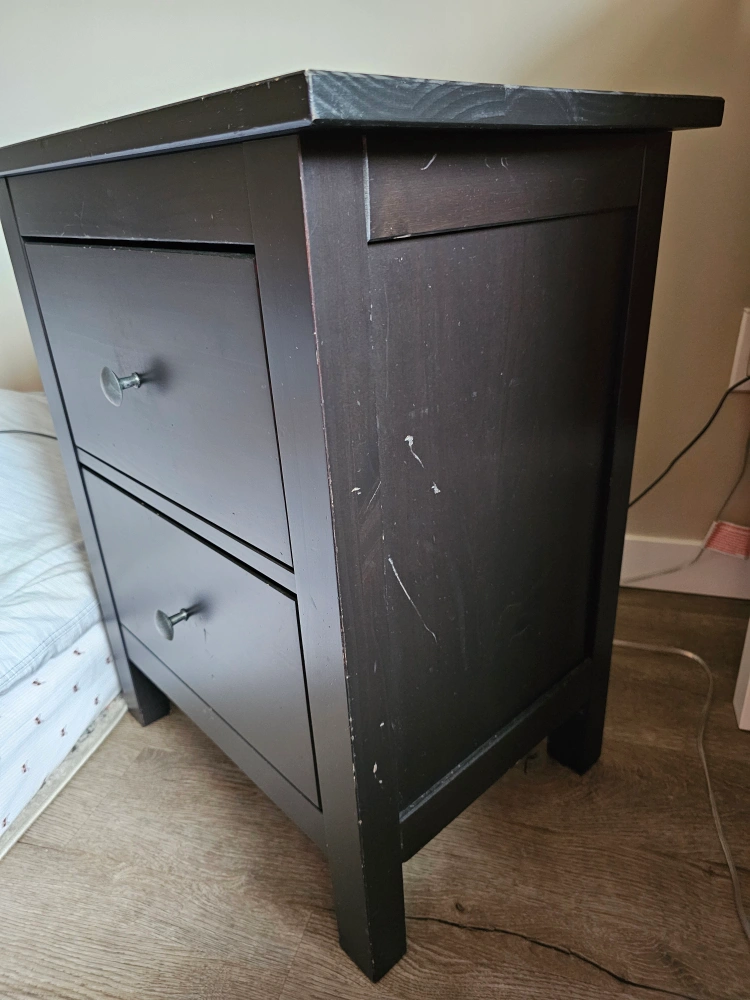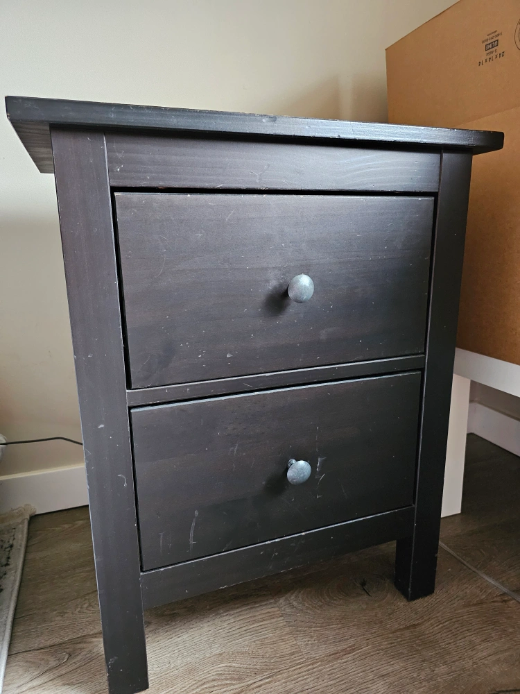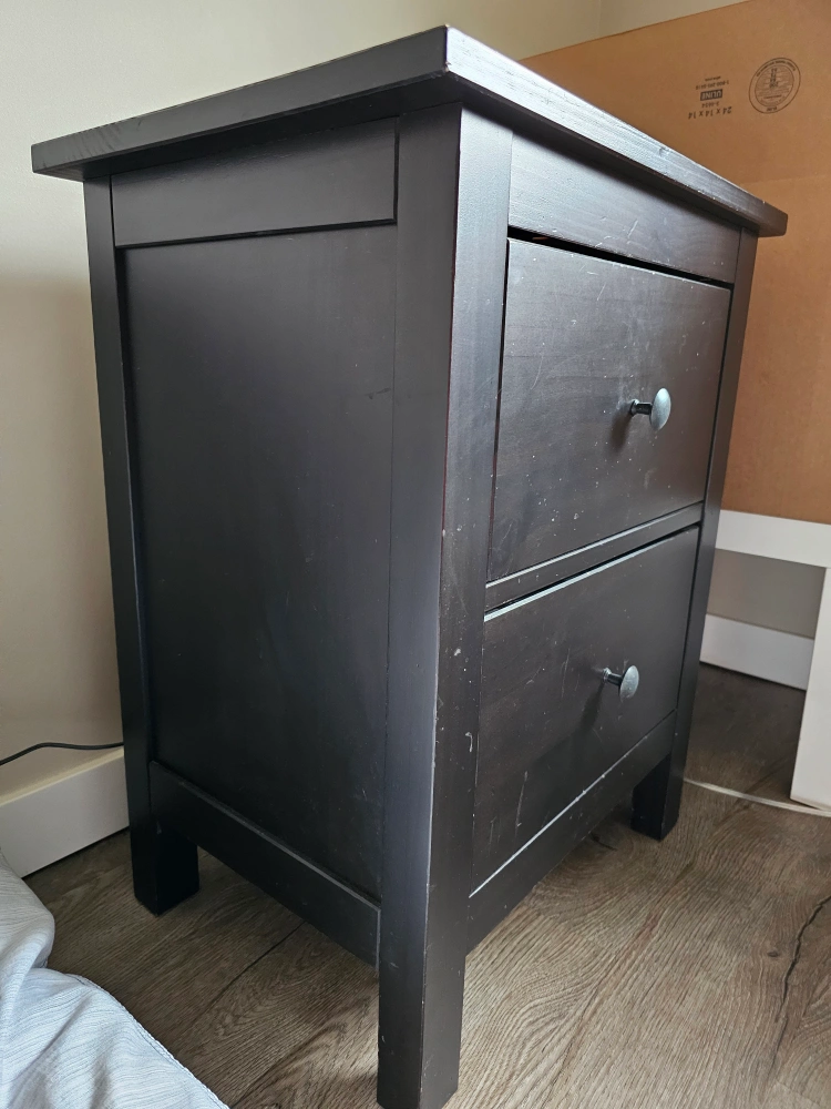 I have 2 nightstands. Black nightstands with two drawers. Drawers are in good condition. Some scratches on the top. Can be fixed with some sanding and paint. Both $70