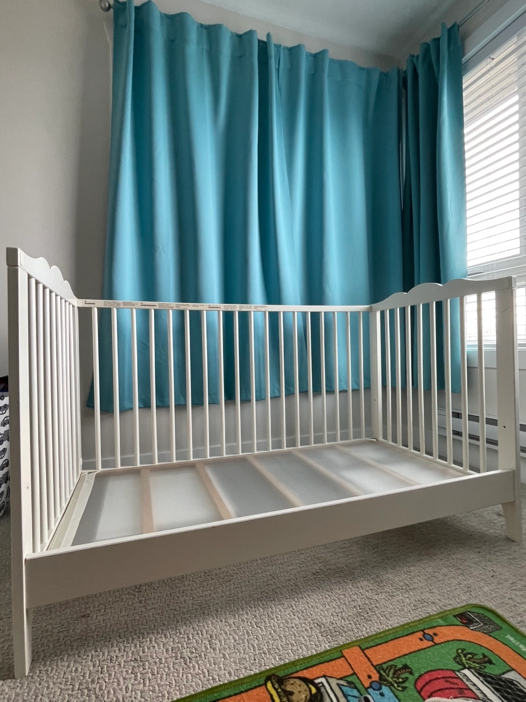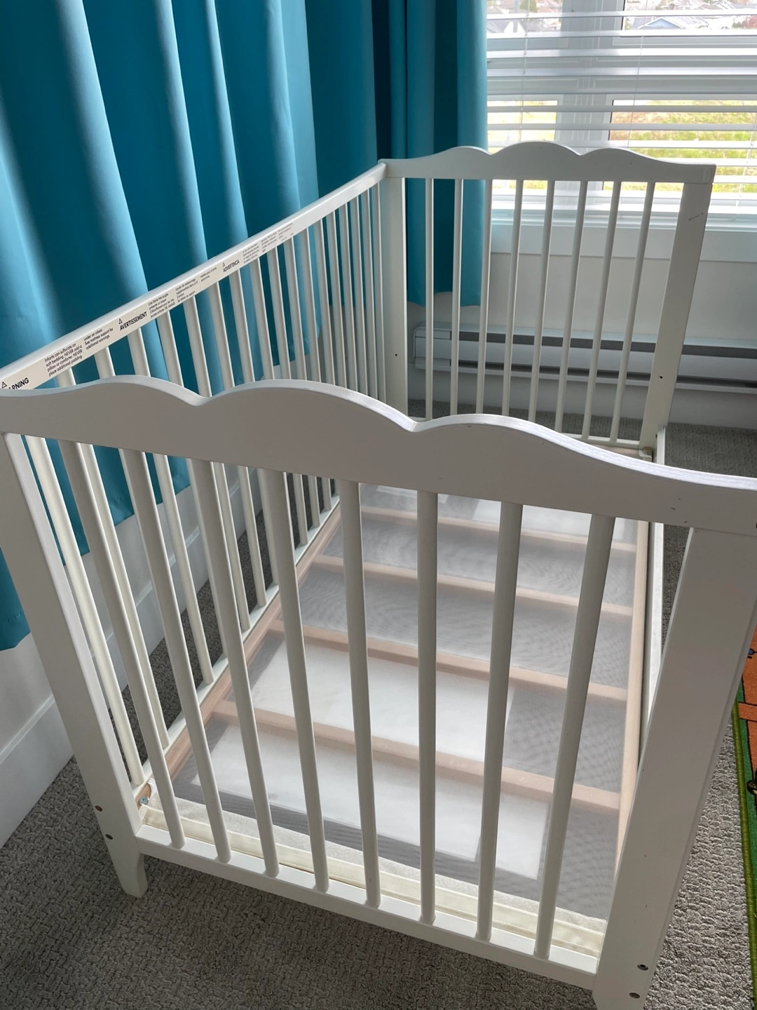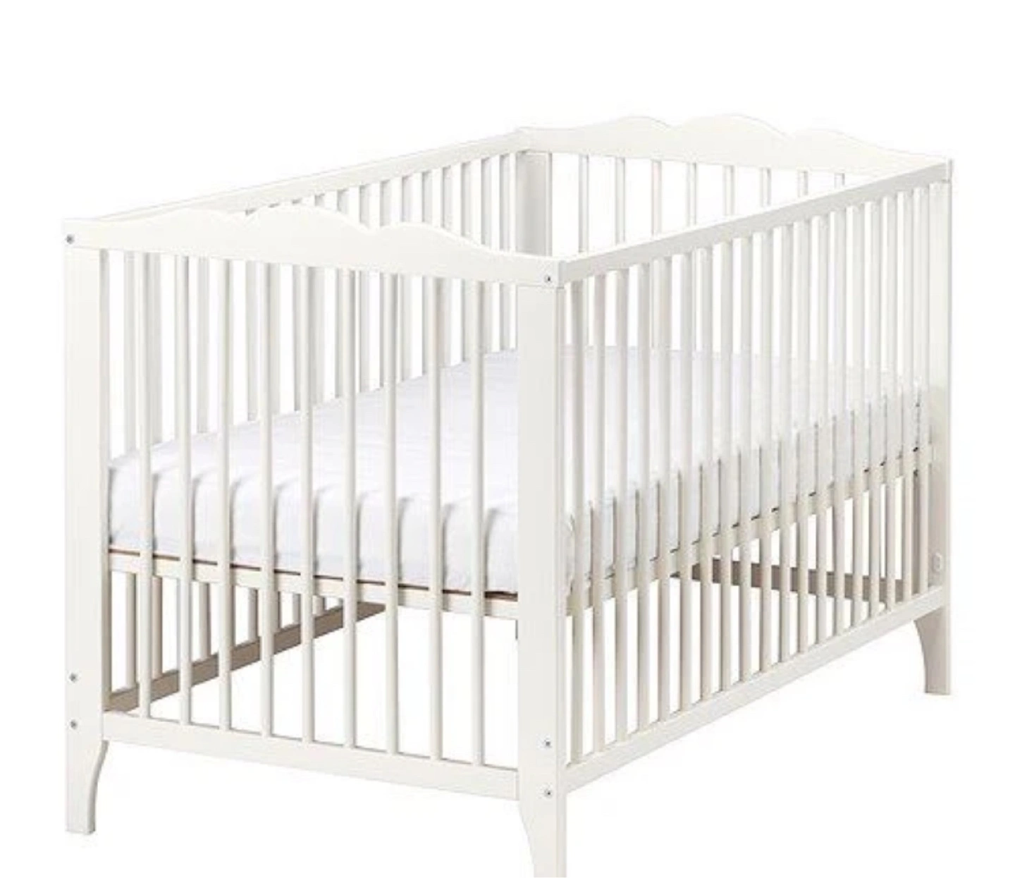 White cot, good condition. Two bed base for different heights. The crib base should be lowered to the lowest level as soon as your child can sit up on their own. One crib side can be removed when the child is big enough to climb into/out of the crib.