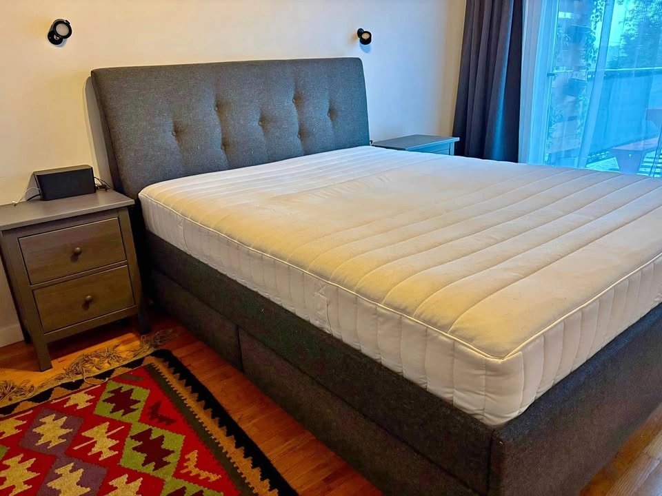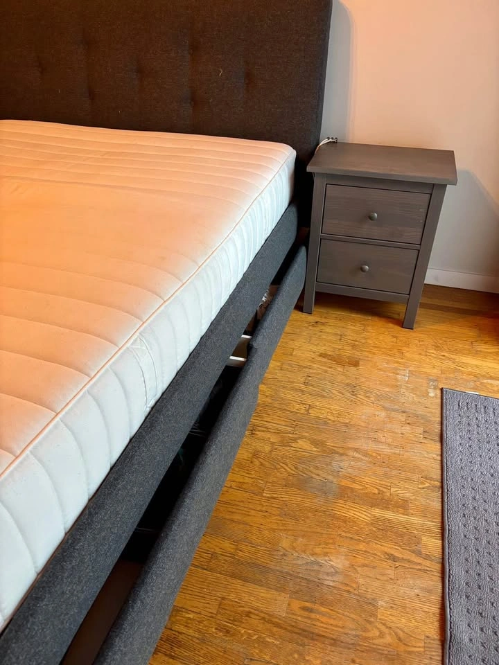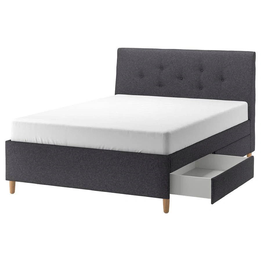 15Beautiful and comfortable queen-size bed frame with upholstered headboard in dark gray fabric. Includes four large under-bed storage drawer Queen Mattress Free