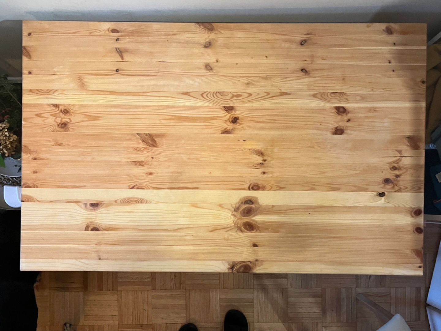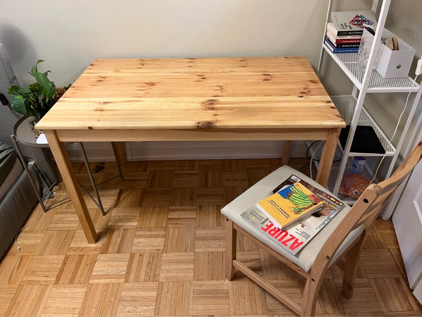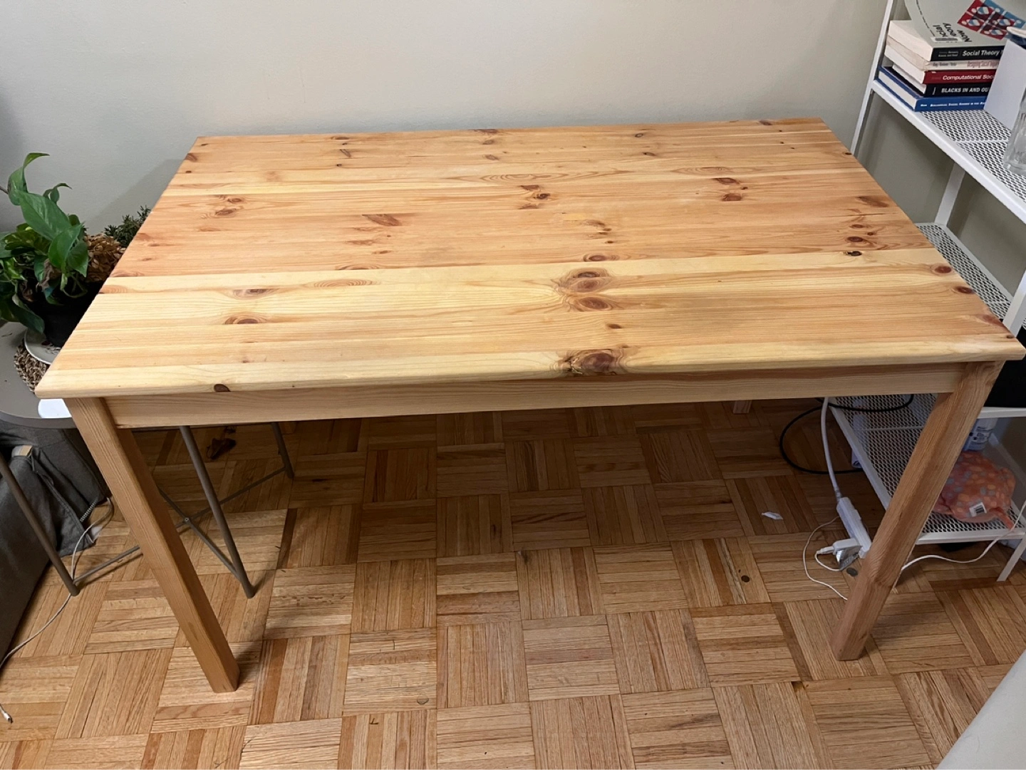 Simple wooden table. Light-coloured wood top. Four legs. Good condition. Perfect for small spaces.