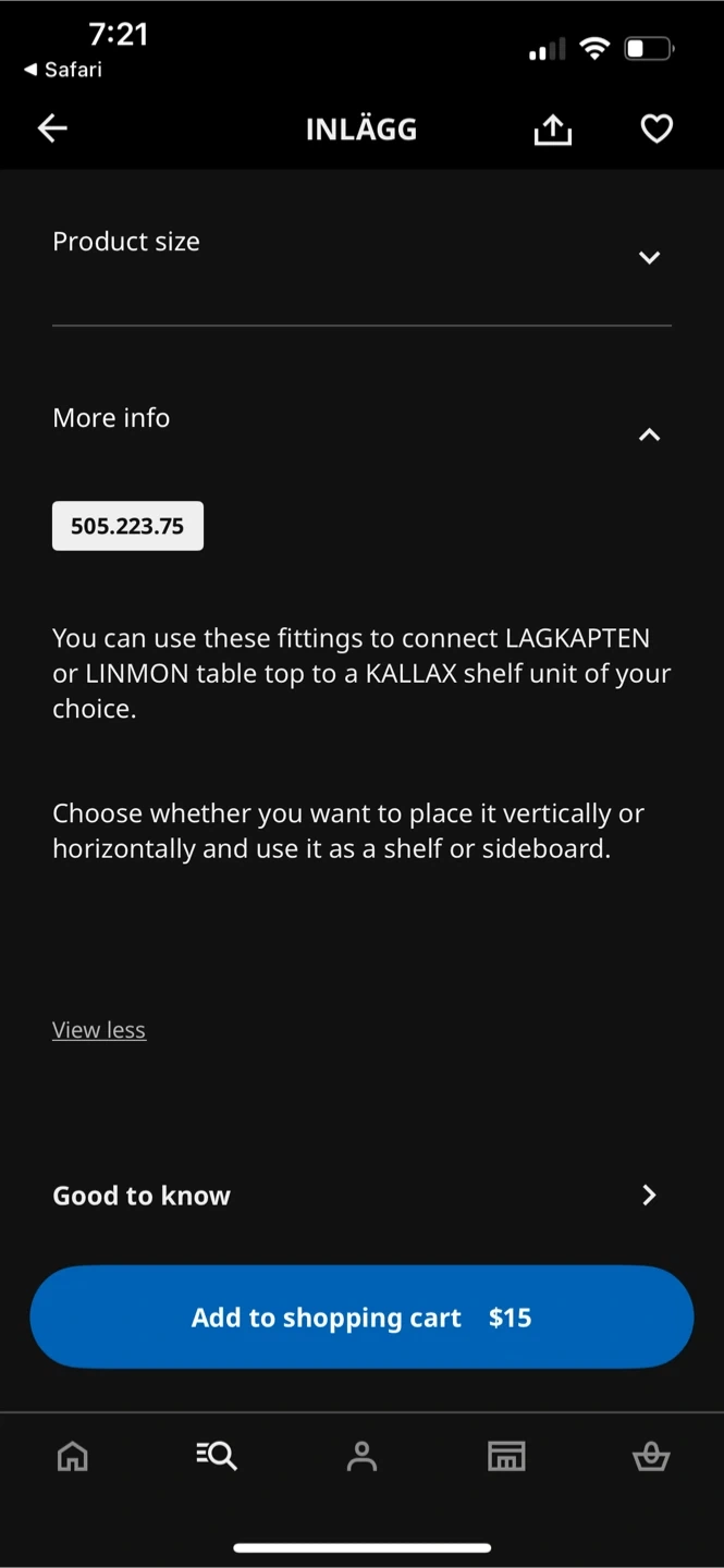 78Selling a set of IKEA INLÄGG connection hardware. These fittings are designed to connect LAGKAPTEN or LINMON table tops to a KALLAX shelf unit. You can choose to place it vertically or horizontally and use it as a shelf or sideboard. $15 retail. I’m asking for just $5