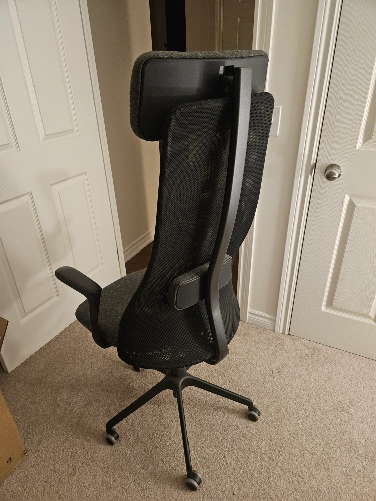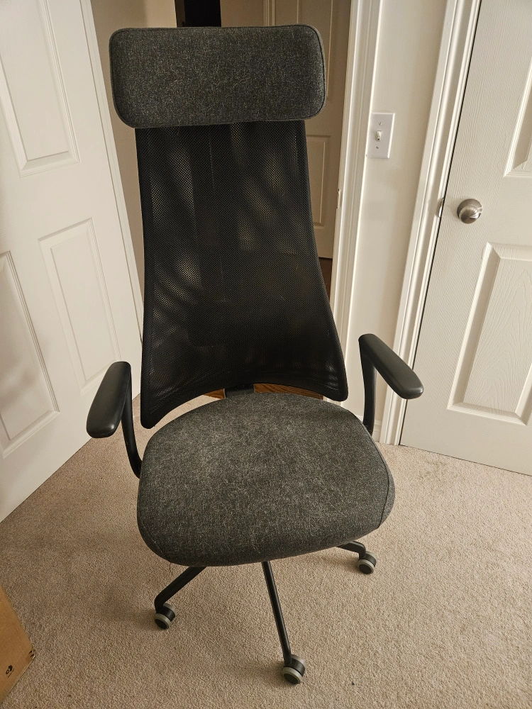 Selling a comfortable grey office chair! It's in great condition and ready for a new home office setup. The chair features a high back with a headrest for added support during long work sessions. It also has armrests and a sturdy base with smooth-rolling casters.