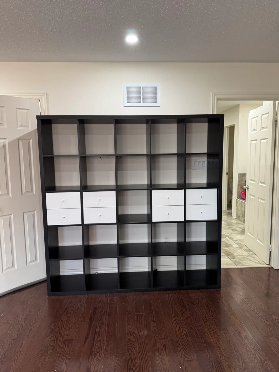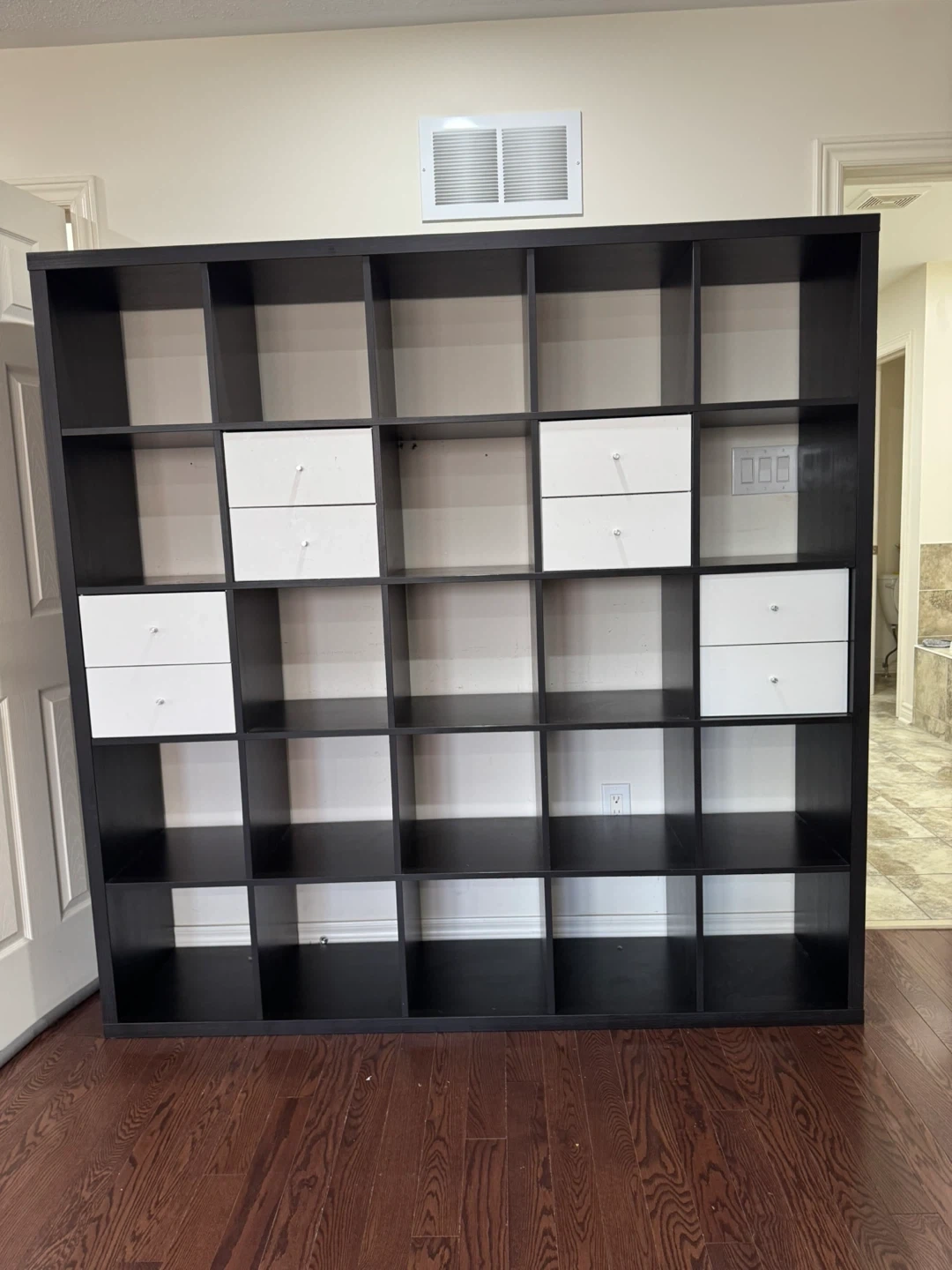 49Selling a black-brown IKEA Kallax shelf unit. It's in great shape and ready to organize your space! Can move white storage spaces around to your preference. Perfect for books, decor, or storage bins. A versatile piece that fits well in any room!