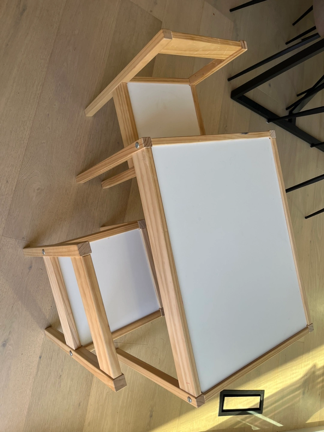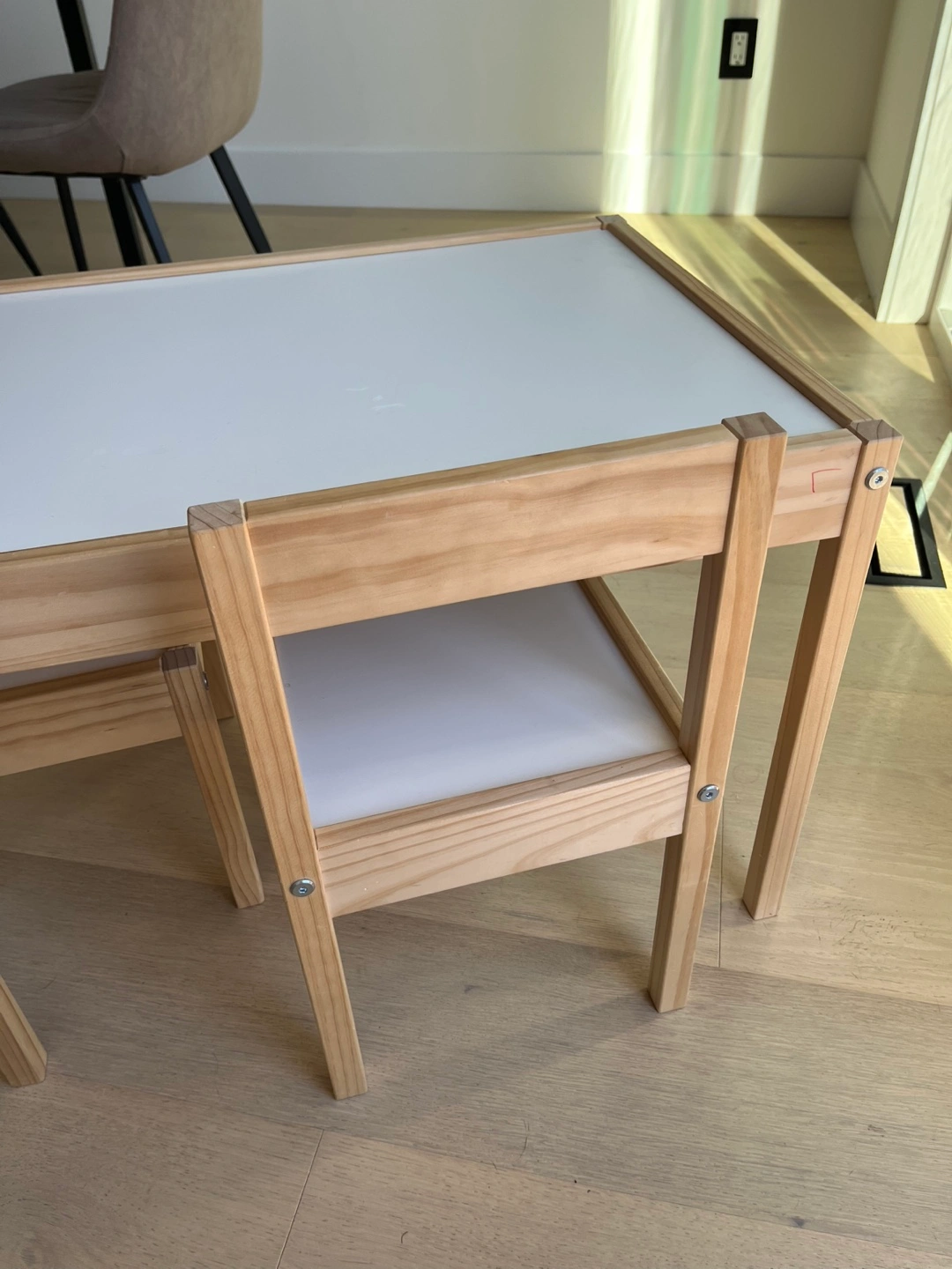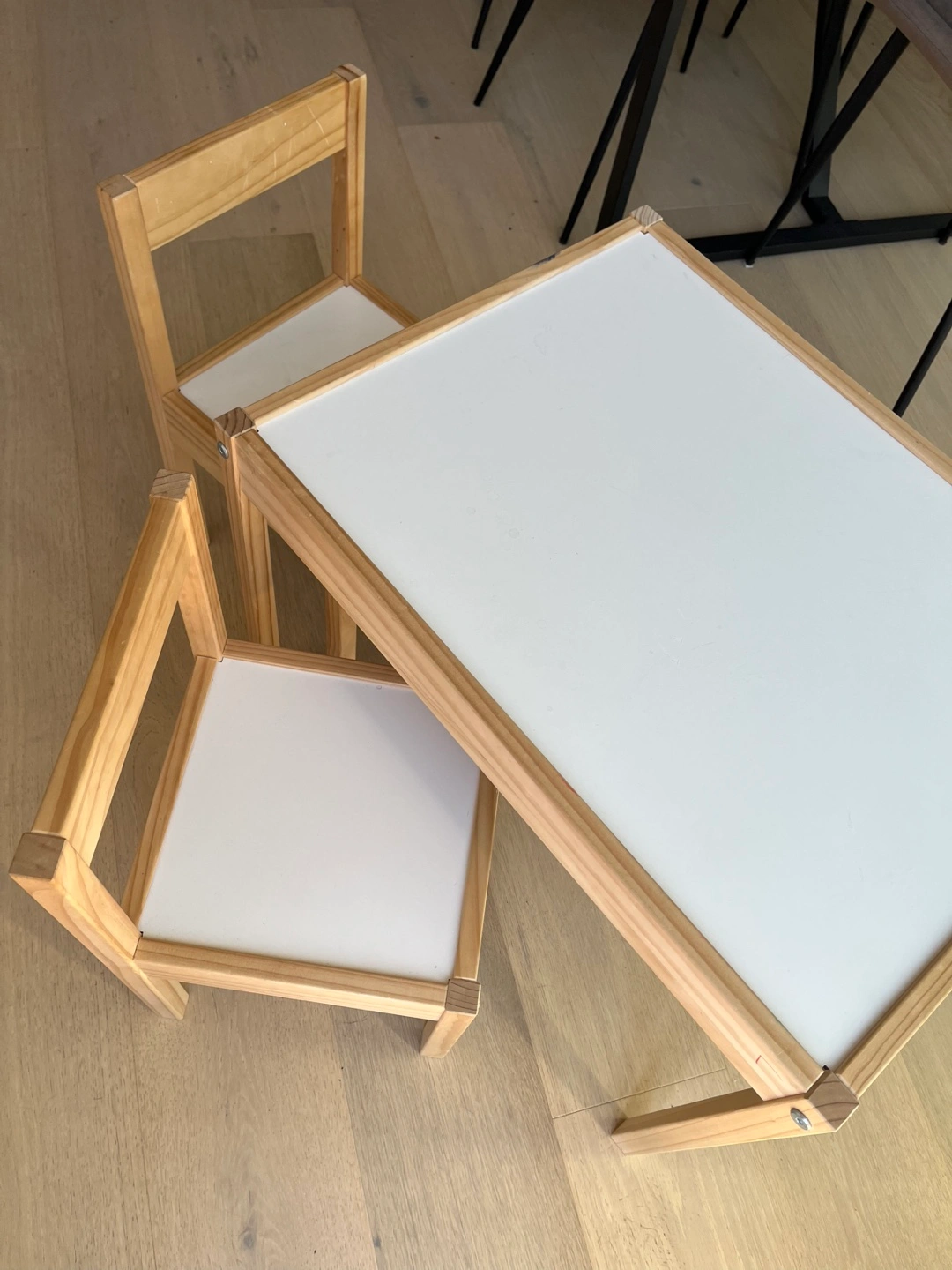 90Selling a kids' table and 2 chairs set! It's made with a natural wood frame and a white tabletop and seat. Perfect for arts and crafts or snack time for your little ones. Pick up only