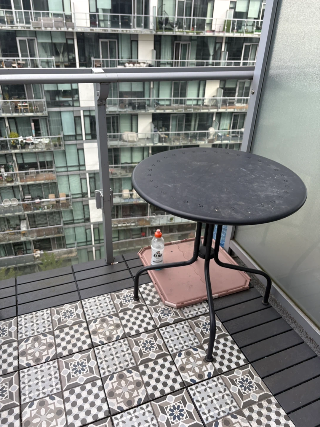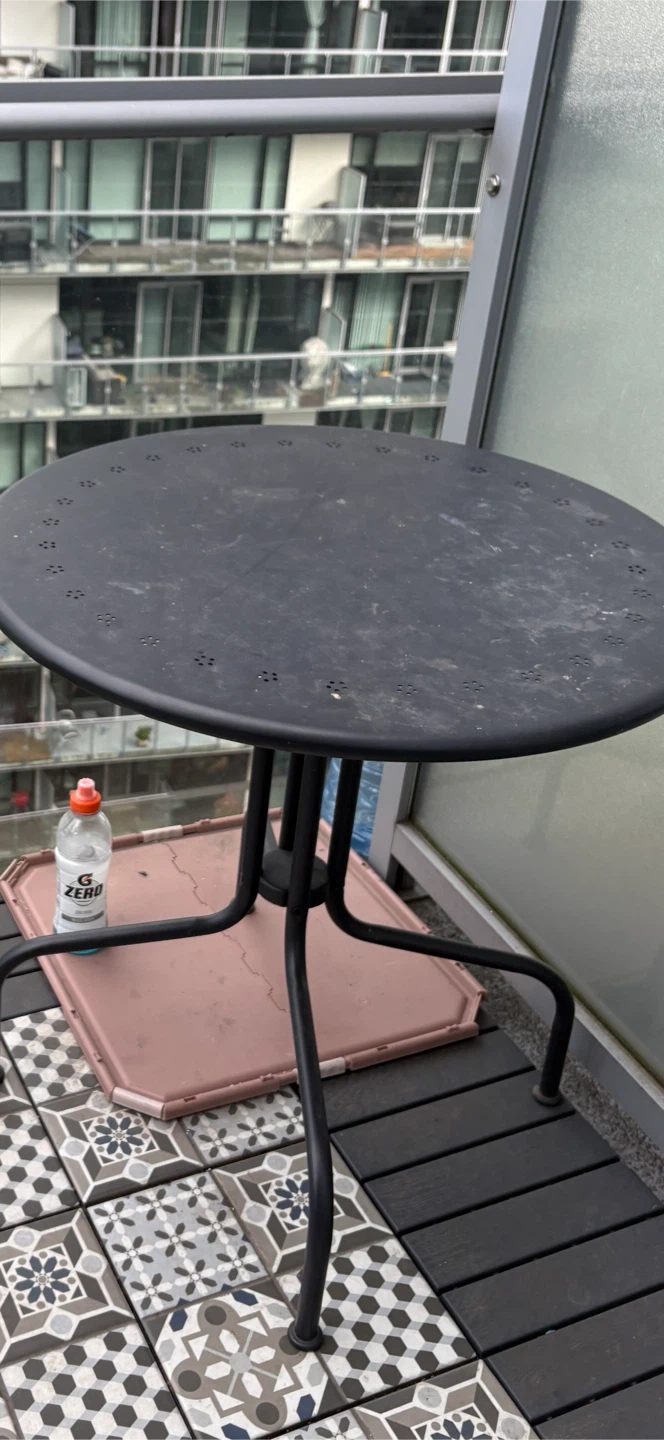 Selling an IKEA LÄCKÖ outdoor table in gray. It's 70 cm (27 1/2 inches) in diameter. This table is perfect for a balcony or small patio. Originally bought for $59!