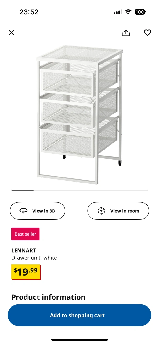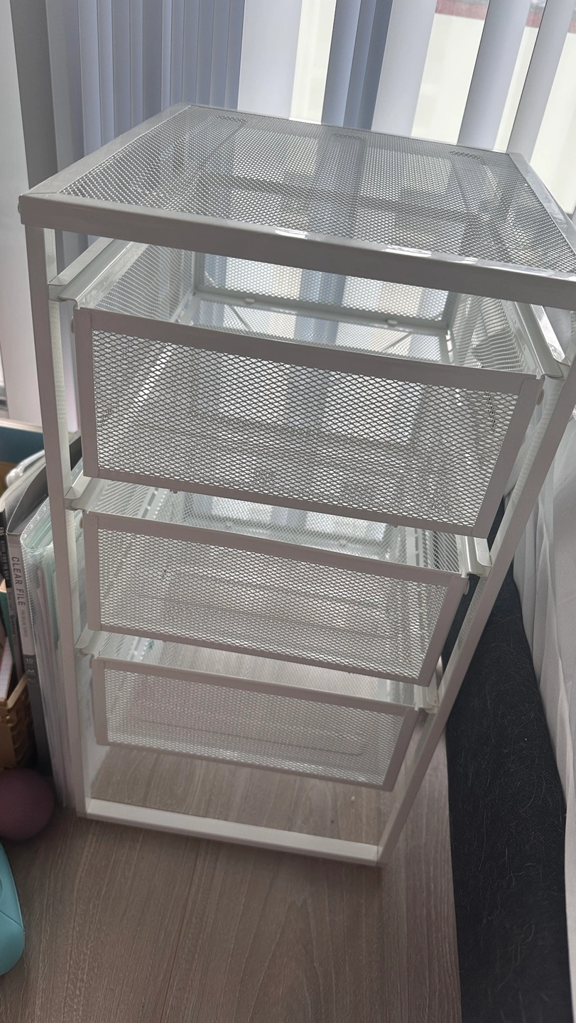 Three-drawer rolling cart. White metal frame and mesh drawers. Great for organizing. And I have three, and you can buy anywhere from one to three, depending on your preference.