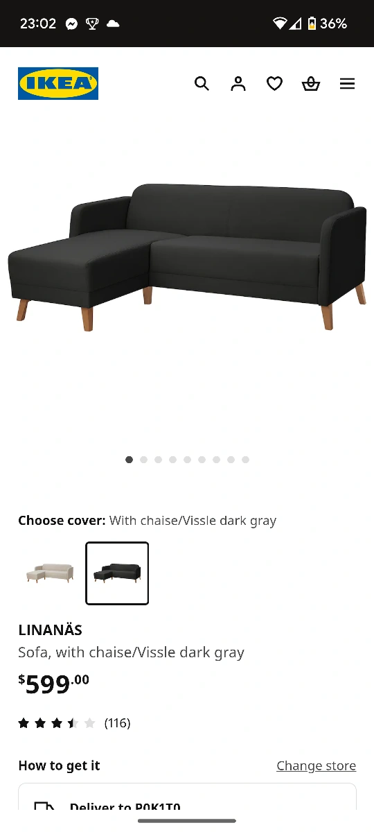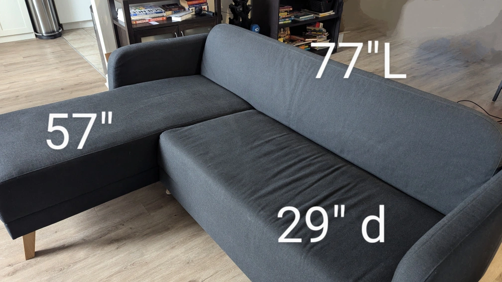 Dark grey IKEA sectional sofa. 77"L x 57" chaise x 29"D. Very good condition. Purchased at the end of August in 2023. Smoke free and pet free home. Must be picked up. No delivery.