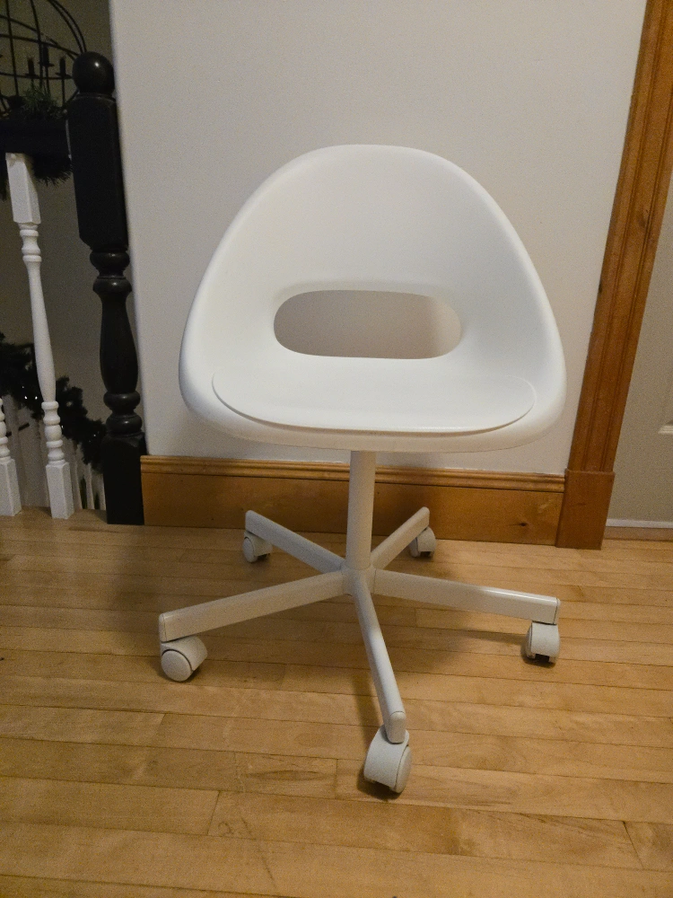 15White swivel chair, five legs, on wheels. Good condition. Lightweight and easy to move.