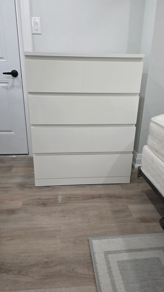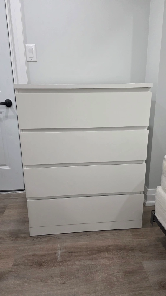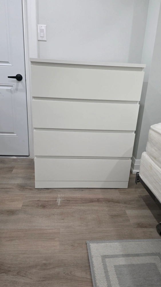 Selling a white IKEA Malm dresser with four drawers! It's in great shape and ready to organize your clothes or anything else you need to store. Perfect for a bedroom, closet, or any space where you need extra storage. It's a simple and clean design that fits well with any decor