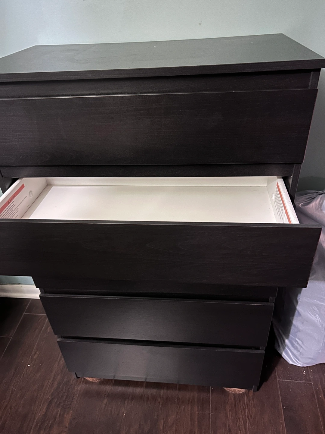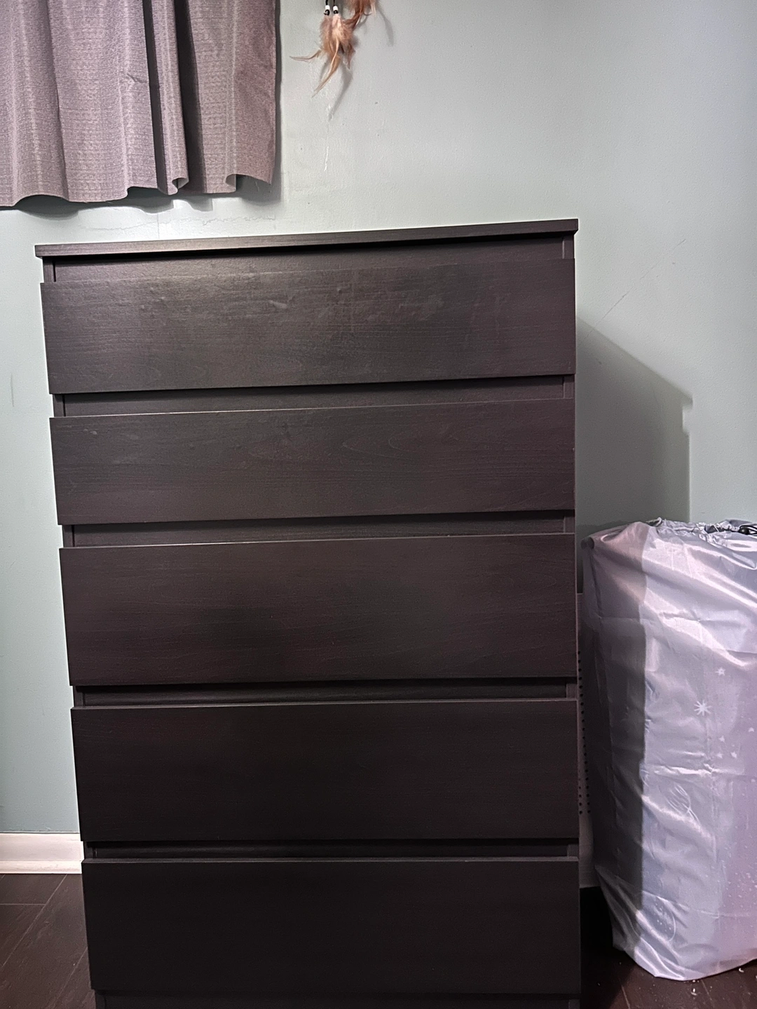 Black IKEA dresser, all the drawers open and clothes nicely, no problems at all. Asking $80. 45inch tall, 15 inch wide, 27.5inch long. Top two drawers are just over 3 inches deep, Bottom 3 are 4 inches deep
