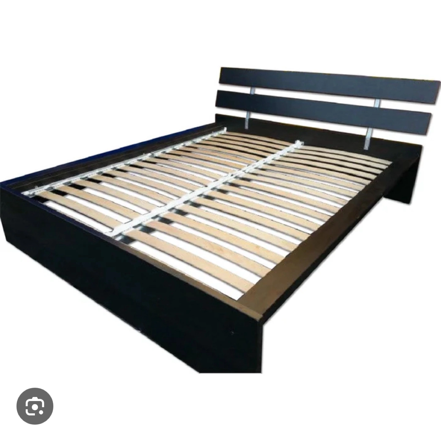 Selling a used IKEA Malm bed frame in brown. It's in good condition and ready for a new home! This bed frame offers a clean and simple design that fits well in any bedroom. Perfect for a minimalist look! Must pick up !