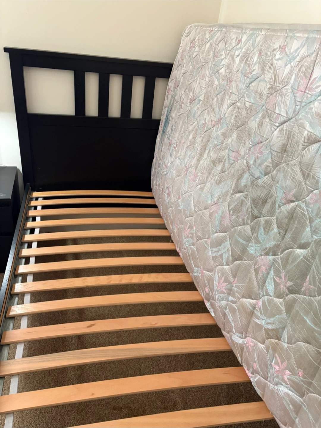 Selling an IKEA Malm bed frame with a nightstand! The set is in good condition and would be perfect for a bedroom. The bed frame is a standard size and the nightstand has drawers for storage. There are some signs of use on the nightstand, but overall it's a great set!
