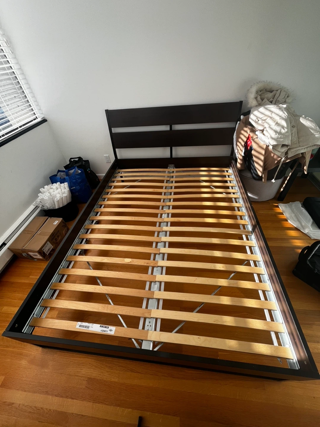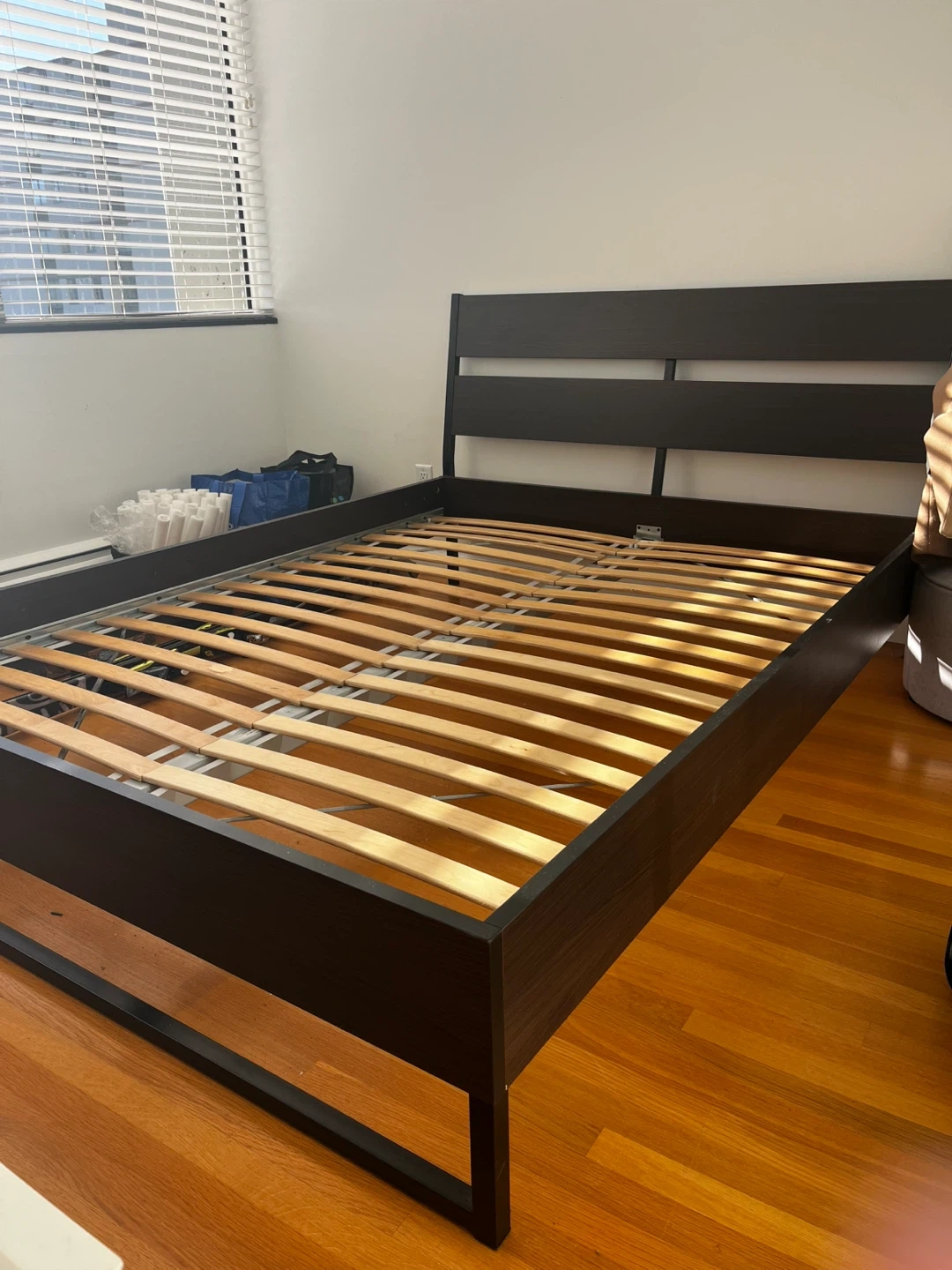 Selling a queen-size IKEA MALM bed frame! It's in great shape and ready for a new home. The dark brown colour is versatile and fits well with any decor. It's a sturdy and reliable bed frame that will provide great support for your mattress