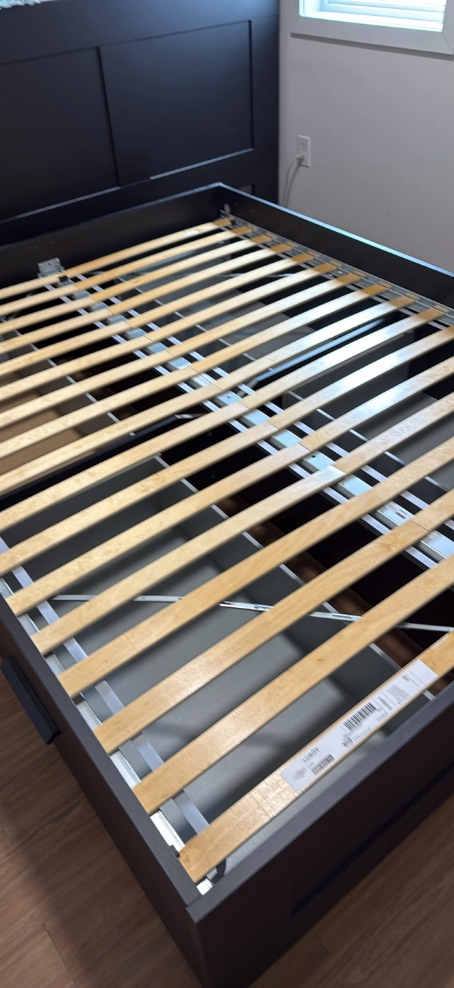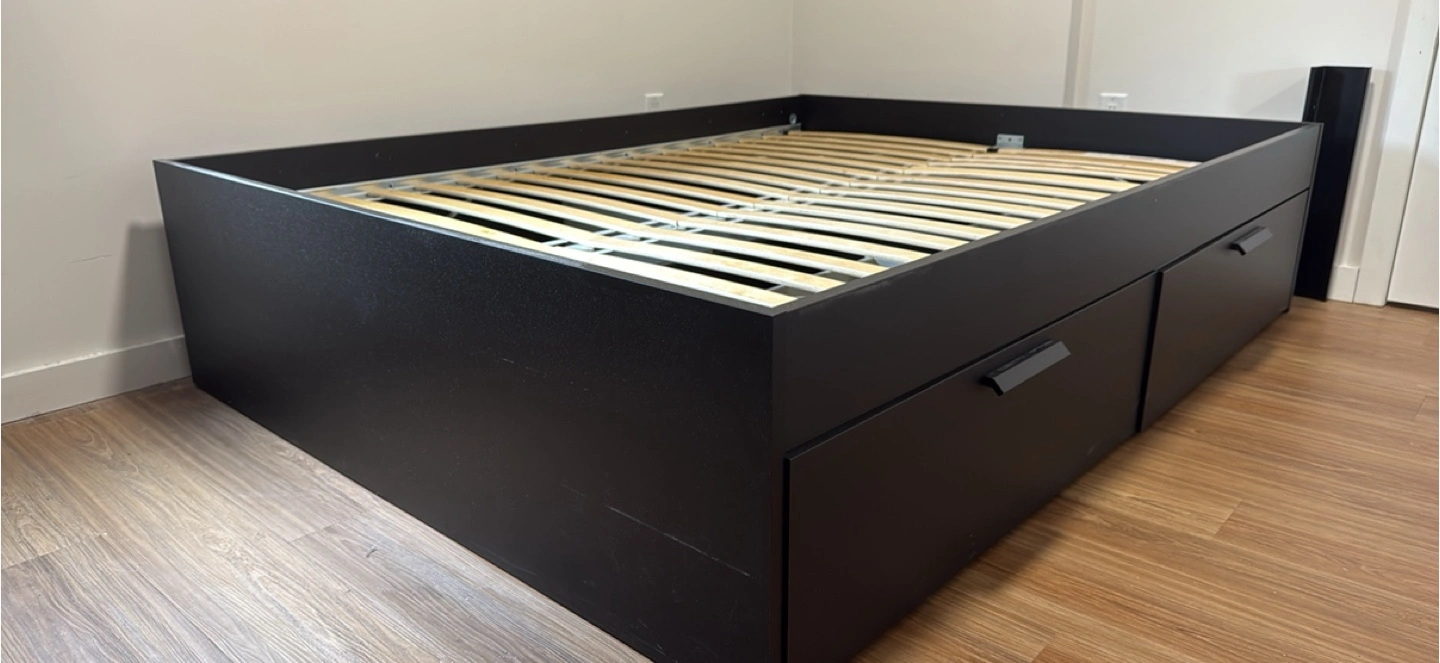 12Queen-size bed frame, black-brown. Includes headboard and two large drawers for storage. Slatted bed base included. Minimal assembly required. Excellent condition.