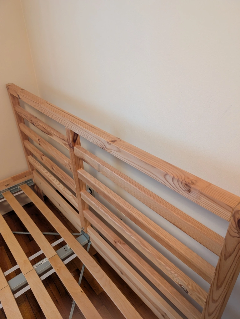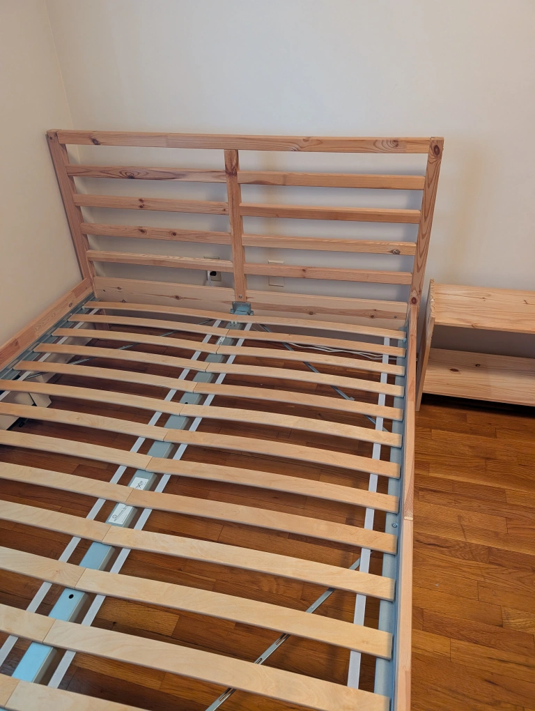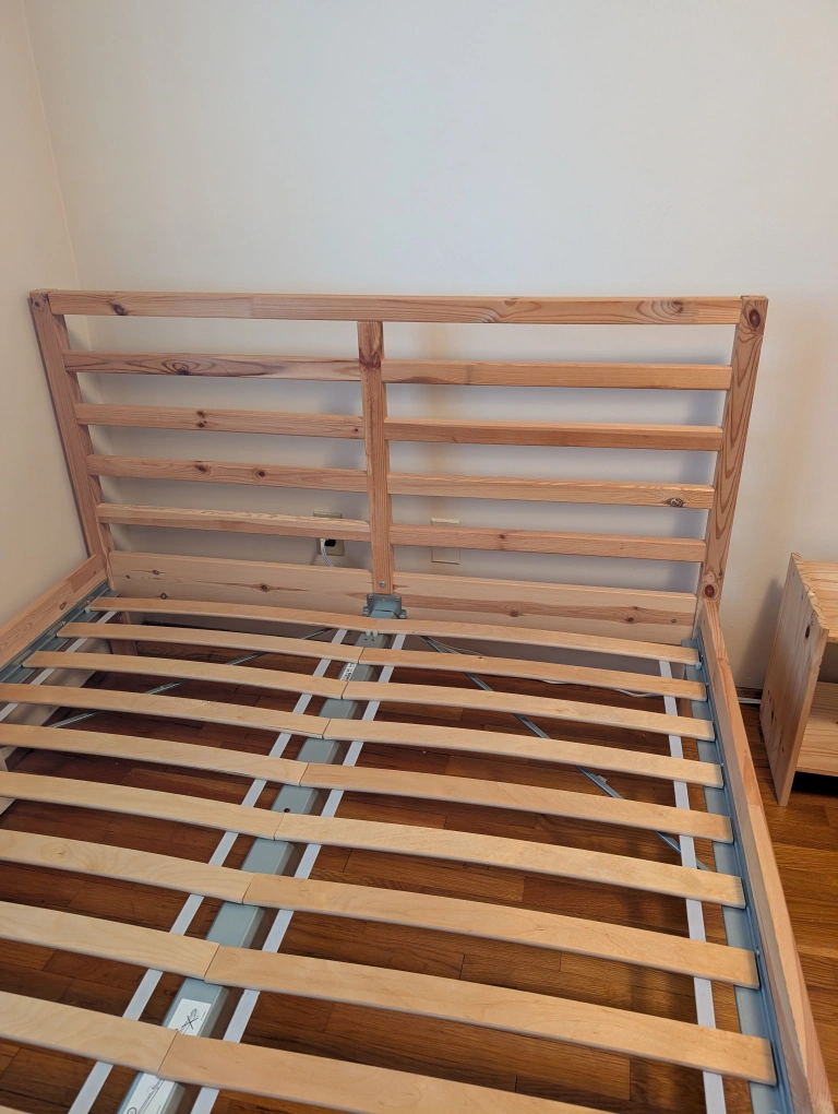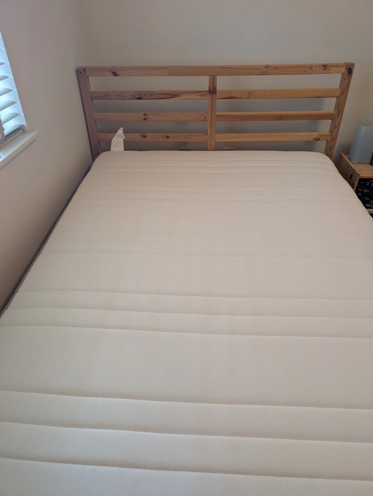 Solid pine wood bed frame. Includes slatted base. Double size. Rarely used spare bedroom, from a non-smoking, non-pet household. Simple design. Easy assembly. Mattress available if desired