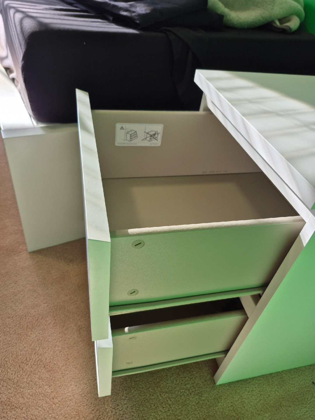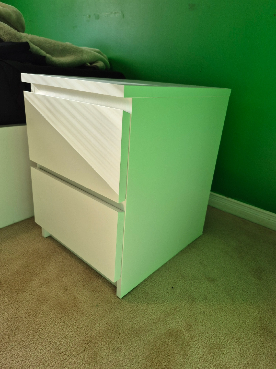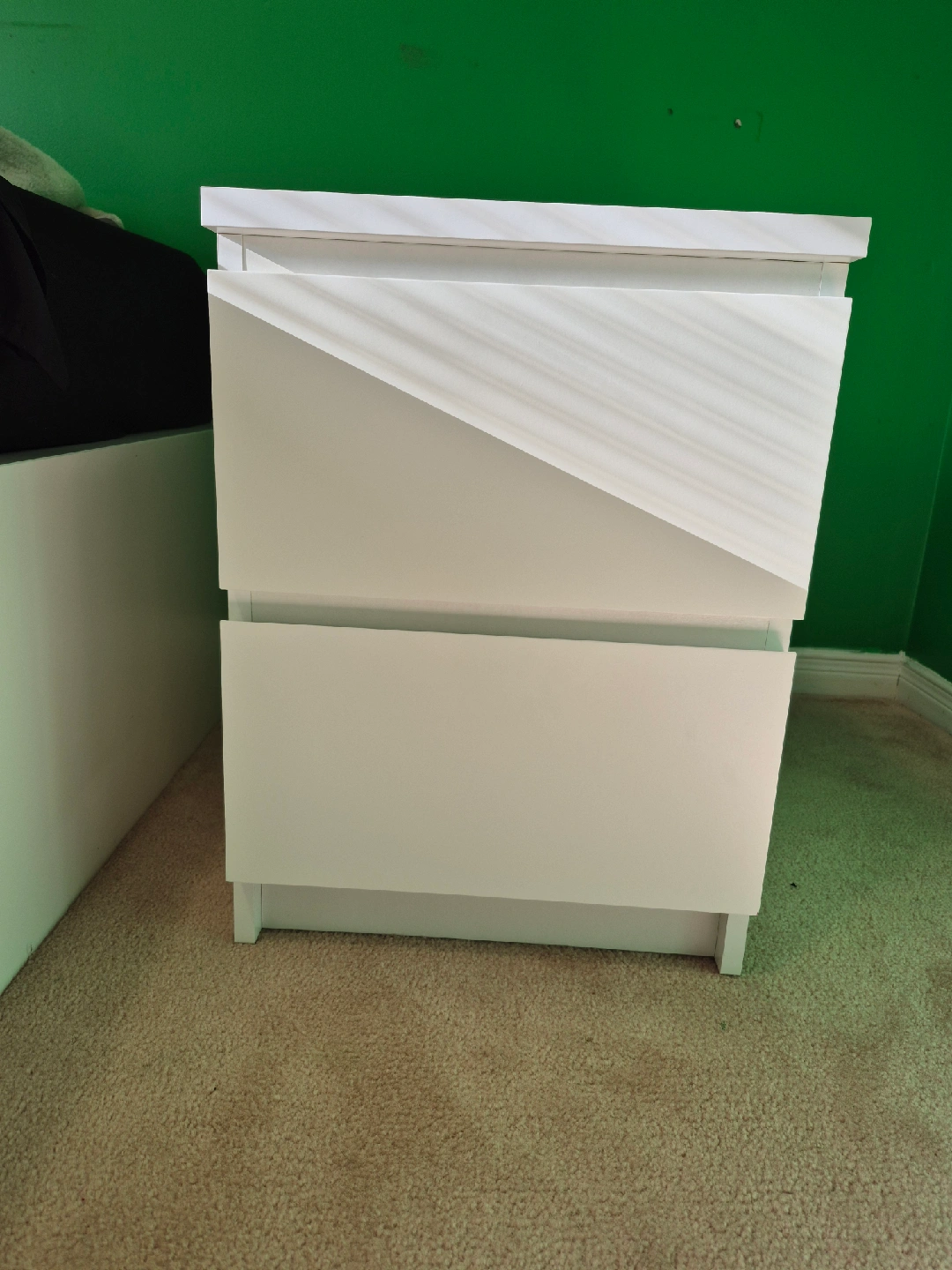 Gorgeous Malm IKEA nightstand that works perfectly. Pick up in Newmarket. It has a few very slight cosmetic scuffs (tiny chip on each back corner, small faint scuffs on the top, a small elevated bumb on the back of the top).
