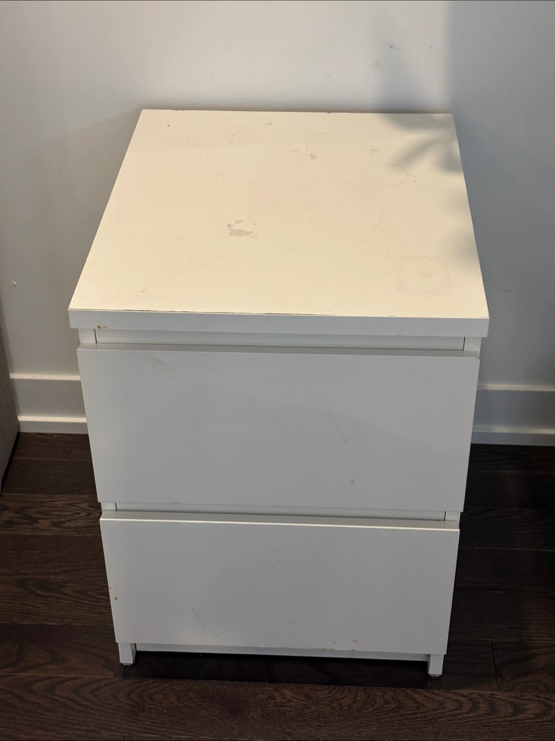 Selling a white IKEA Malm nightstand. It has two drawers for storage. There are some signs of use on the top surface, but otherwise it's in good condition! Perfect for adding some storage beside your bed Pick up only. (Yorkdale mall ) Price is firm, I won’t answer negotiations.