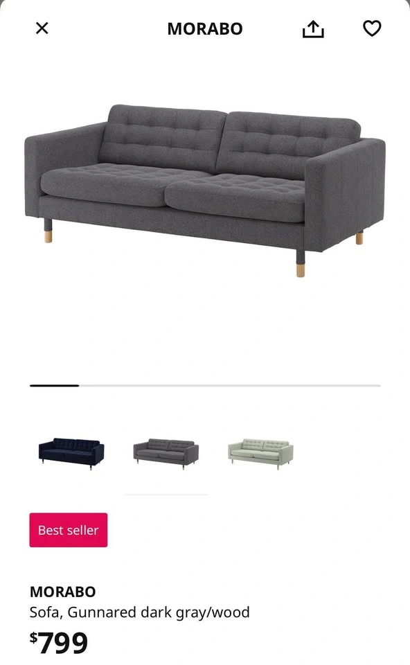 2–3 Seater IKEA Marabo Sofa for Sale – $400 Used for about 3 years. Color: Dark grey. Still in excellent condition — the seat fabric has stretched slightly from normal use, but there’s no visible sagging or damage. Spacious and comfortable — fits 2 people comfortably or 3 if needed Deep seat, great for lounging Non-smoking, pet-free home Legs are removable for easy moving and cleaning Pickup only near North York