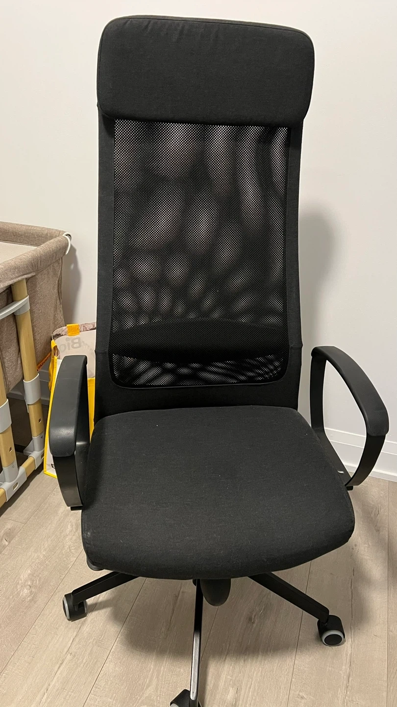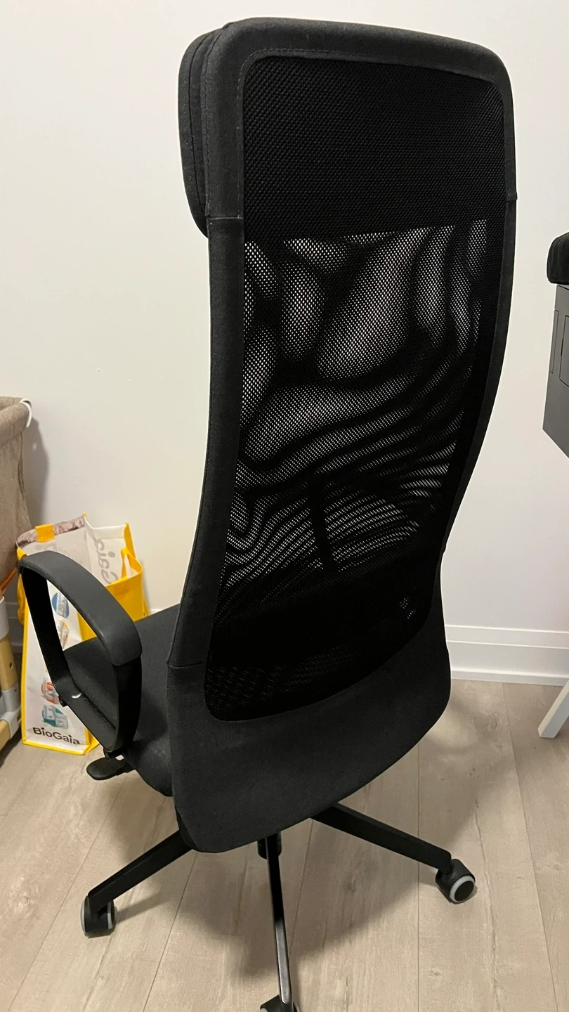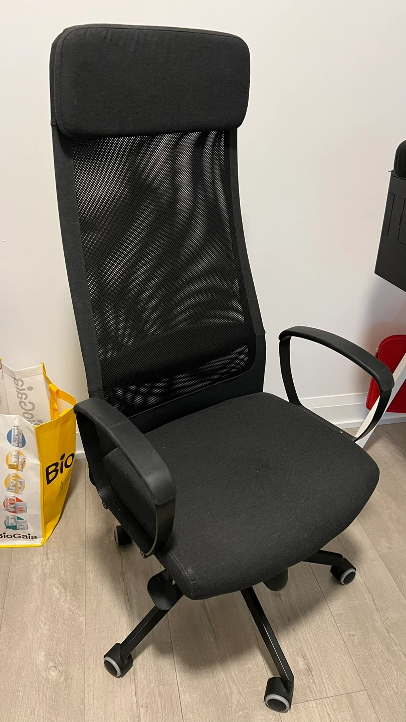 10Selling a used IKEA Markus office chair in black. It's in good condition and slightly used! ready for a new home office! This chair features a high back with mesh for breathability and adjustable armrests for added comfort. Perfect for long hours of work or gaming.