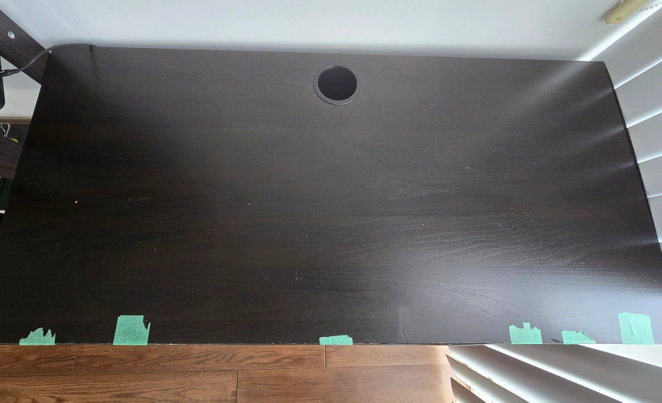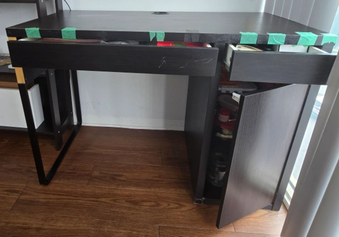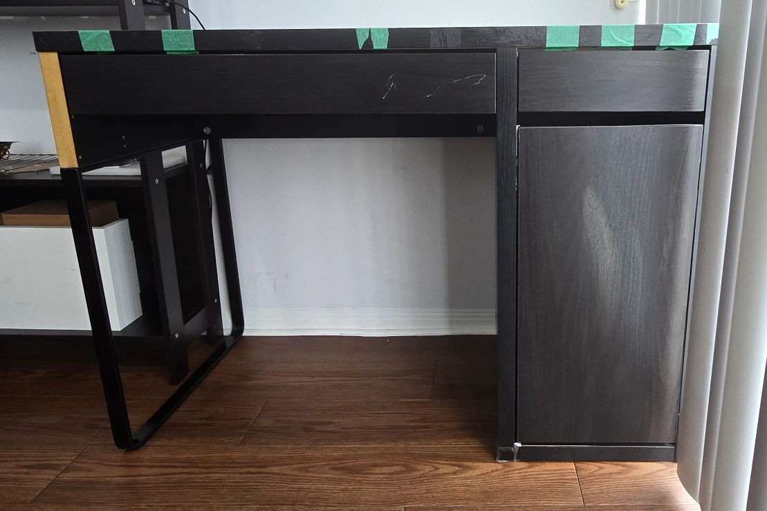 Selling black desk that's perfect for a home office or study space! It has a sleek design with a drawer and a cabinet for storage. There are some signs of wear, as seen in the pictures, but it's still sturdy and functional.