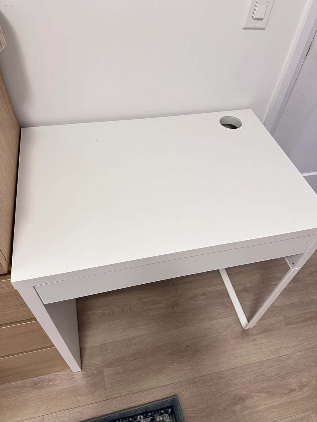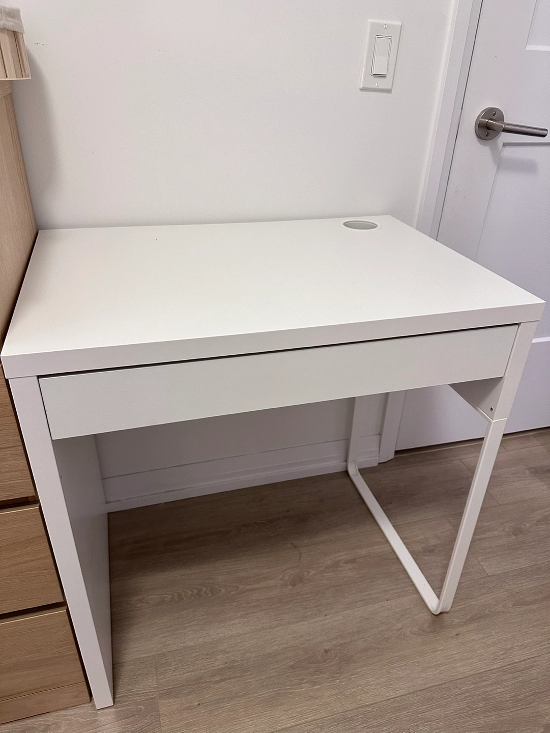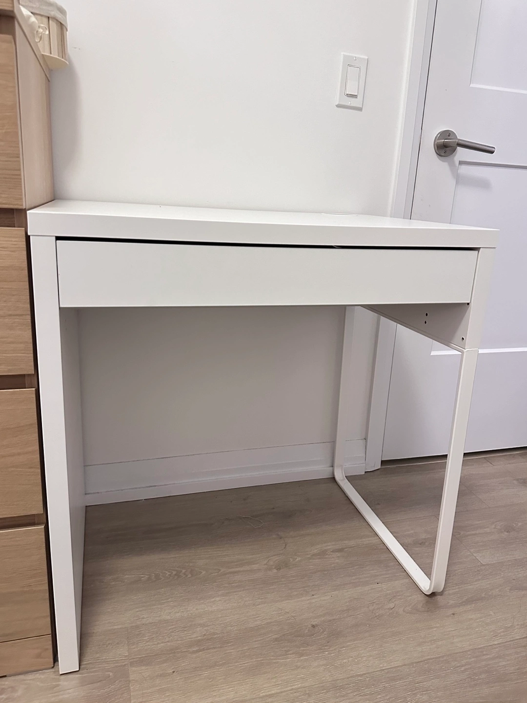 Moving Out Sale Ikea small white desk. One drawer. Good for small spaces! Bought only a few months ago selling because i’m moving out. In perfect condition no stain or scratches. Like brand new, Bought for $75 only selling for $55 Fully assembled and ready for pick up!