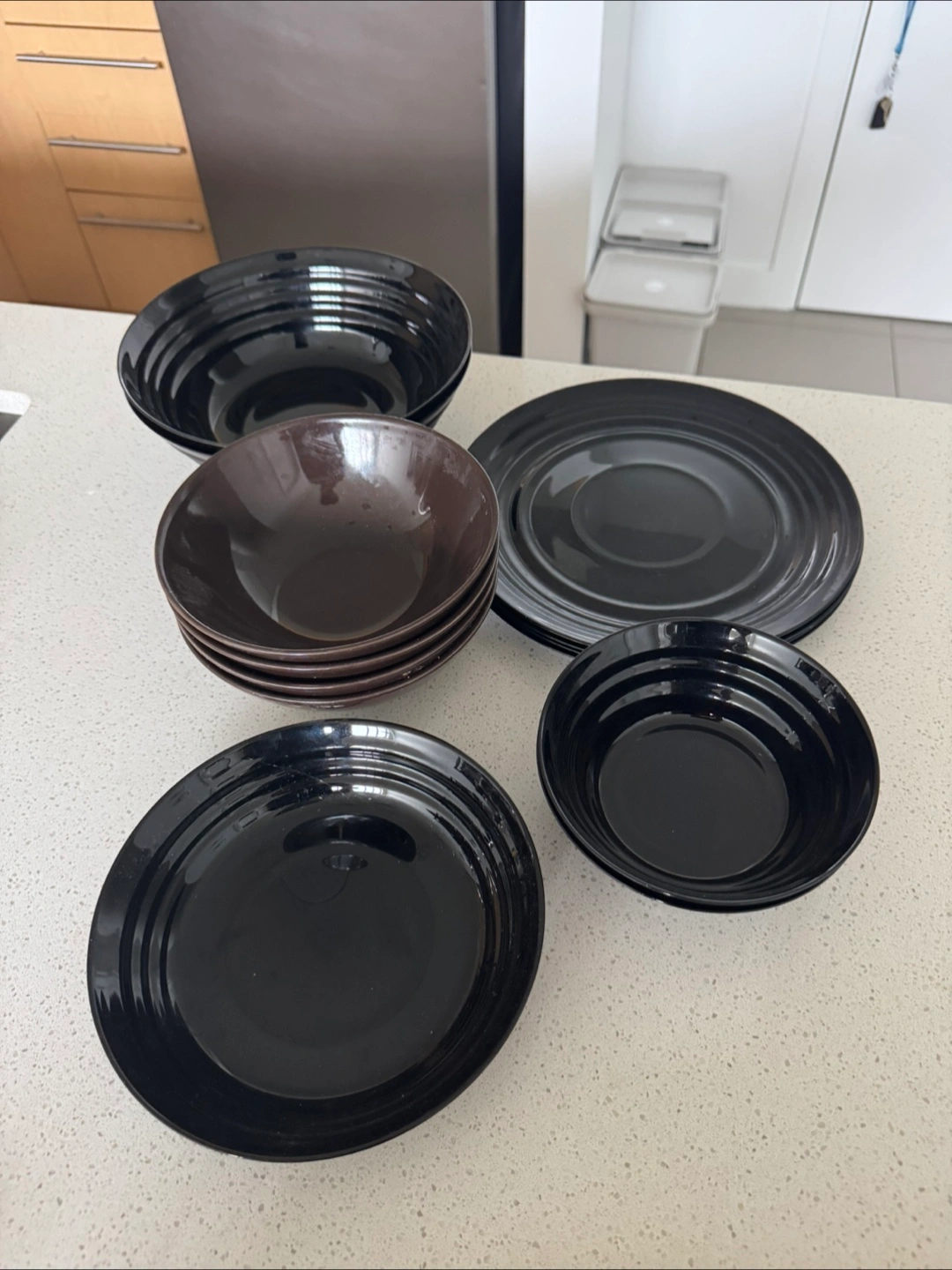 4 x Brown bowls 2 x Small black bowls 1 x Medium black bowl 2 x Large black bowl 4 x Black plates