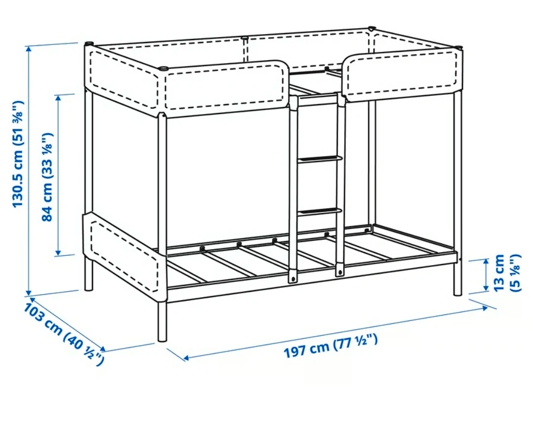 10Selling an IKEA Mydal bunk bed frame! This bed frame is perfect for kids' rooms or small spaces. It's in great condition and ready for a new home. Key Specifications: - Dimensions: 197 cm (77 1/2") x 103 cm (40 1/2") x 130.5 cm (51 3/8") - Material: Metal frame If you're looking for a space-saving and sturdy bunk bed, this is a great option!