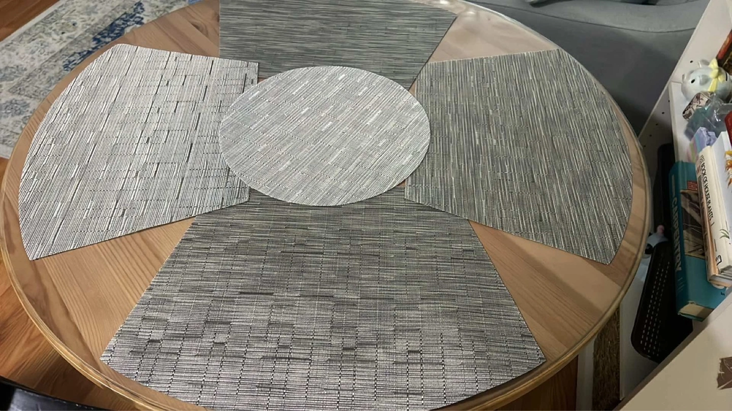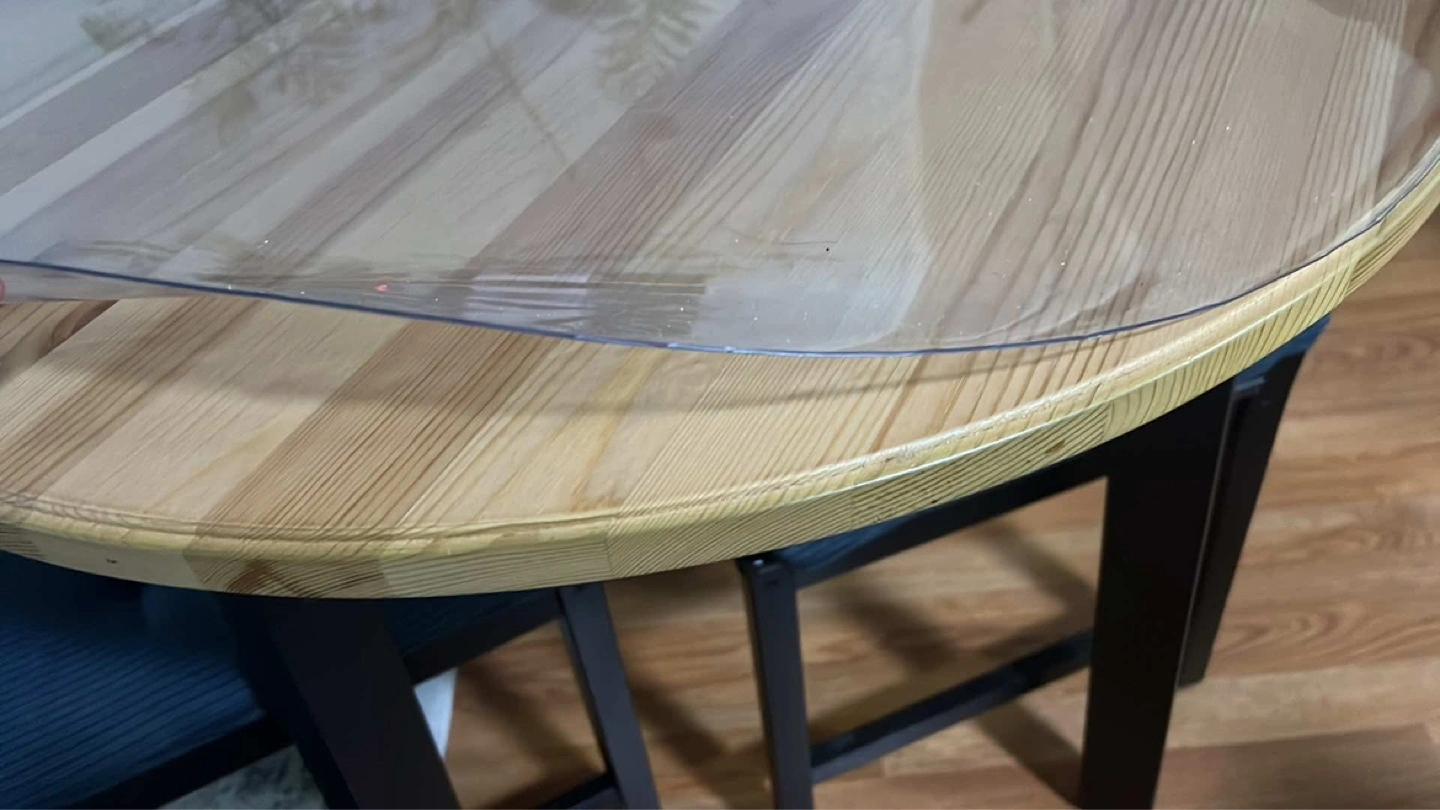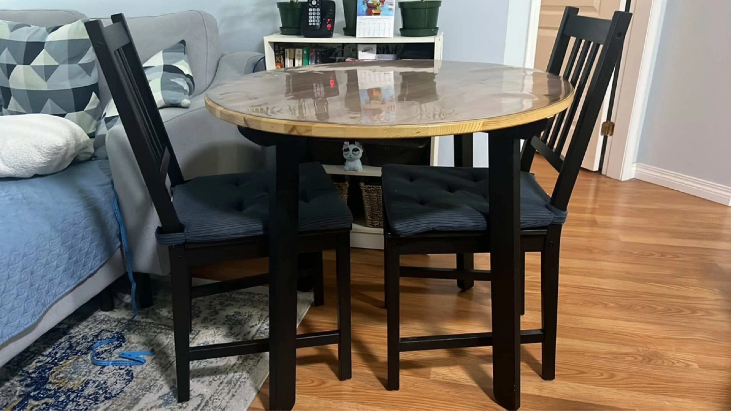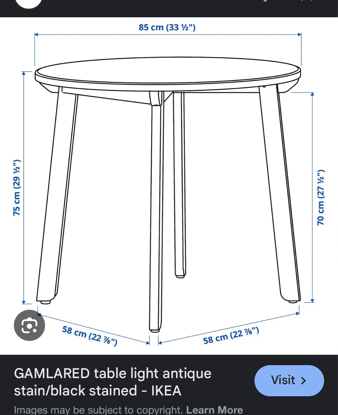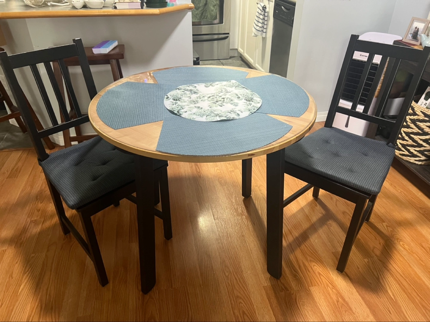 Ikea Small round table and two chairs. Great for small spaces. Simple design, easy to assemble and disassemble. Tabletop is light wood, legs are dark brown/black. Chairs are dark brown/ with minute scratches. Includes plastic cover and 2 sets of placemats.