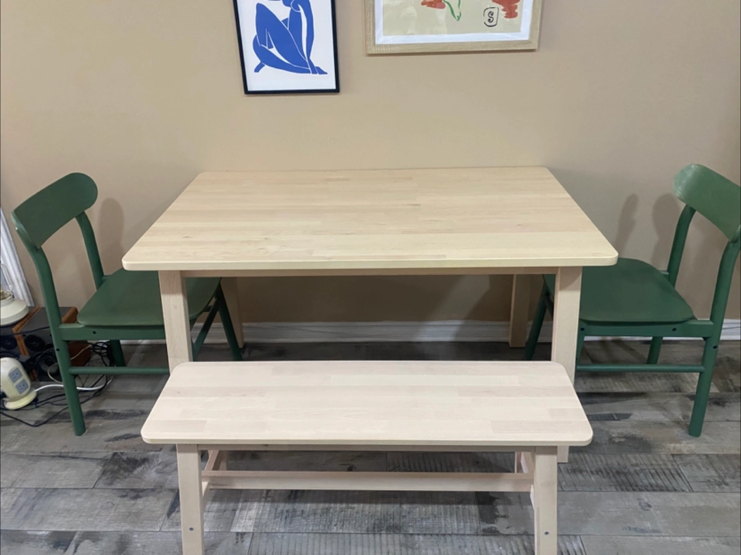120Selling a cute IKEA NORRAKER table and a bench! The set is in very good condition and ready for a new home. We used it only for record player. Green chairs are not included (They’re sold)
